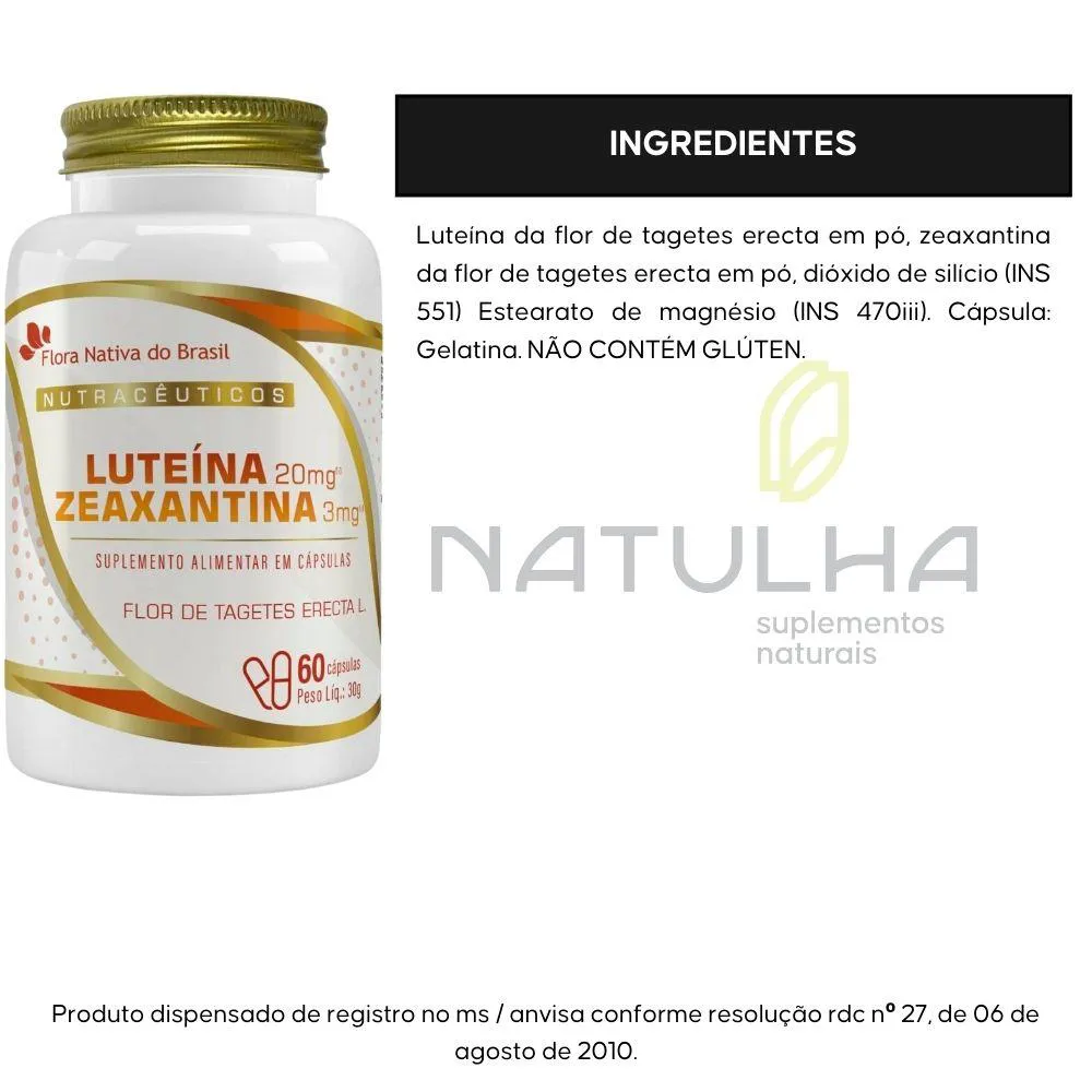Luteína da flor de tagetes erecta em pó, zeaxantina da flor de tagetes erecta em pó, dióxido de silício (INS 551) Estearato de magnésio (INS 470iii). Cápsula: Gelatina. NÃO CONTÉM GLÚTEN.