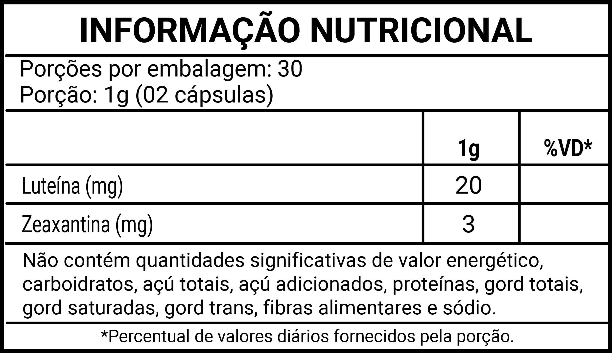 Luteína da flor de Tagetes erecta em pó, zeaxantina da flor de Tagetes erecta em pó, antiumectante (dióxido de silício) e lubrificante (estearato de magnésio).