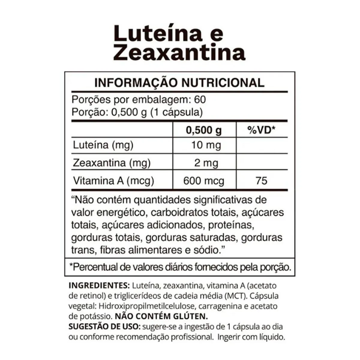 Luteína, zeaxantina, vitamina A (acetato de retinol), triglicerídeos de cadeia média (MCT). Cápsula vegetal: hidroxipropilmetilcelulose, carragenina, acetato de potássio. Informações: