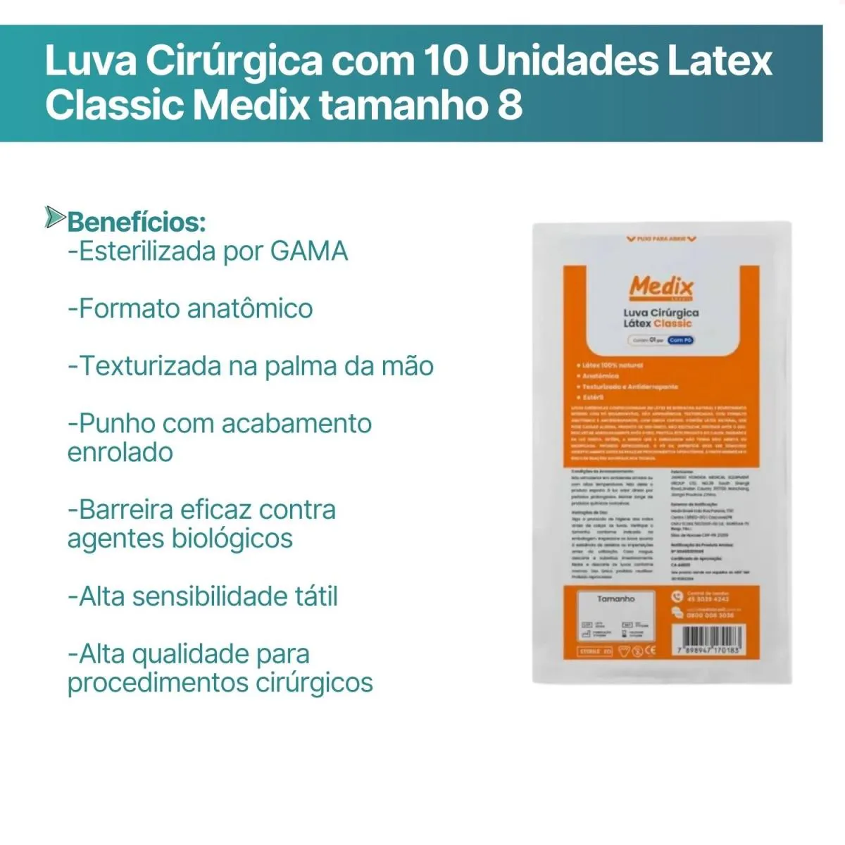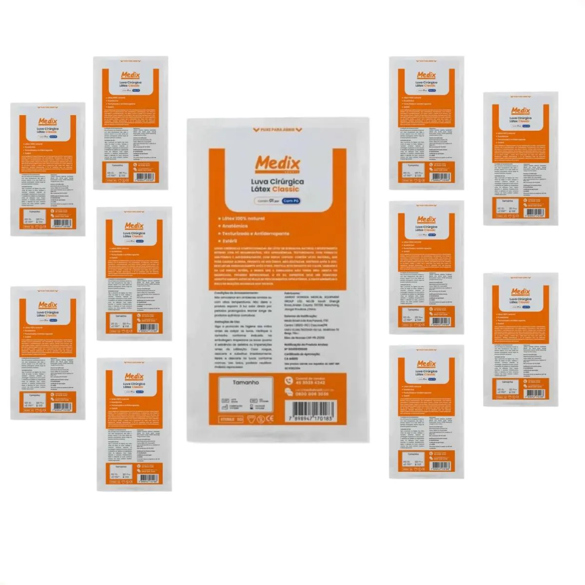 A Luva Cirúrgica Classic Medix foi desenvolvida para oferecer proteção e segurança a profissionais da saúde e pacientes em procedimentos que envolvem risco de contato com sangue, fluidos corporais, mucosas ou pele não íntegra. É indicada para uso hospitalar, clínico, odontológico, laboratorial e procedimentos cirúrgicos que exigem barreira contra agentes biológicos. Fabricada em látex de borracha 100% natural, possui textura na palma, formato anatômico, pó interno de amido de milho bioabsorvível que facilita o calçamento, além de punho com acabamento enrolado, que aumenta a resistência e a segurança durante o uso.