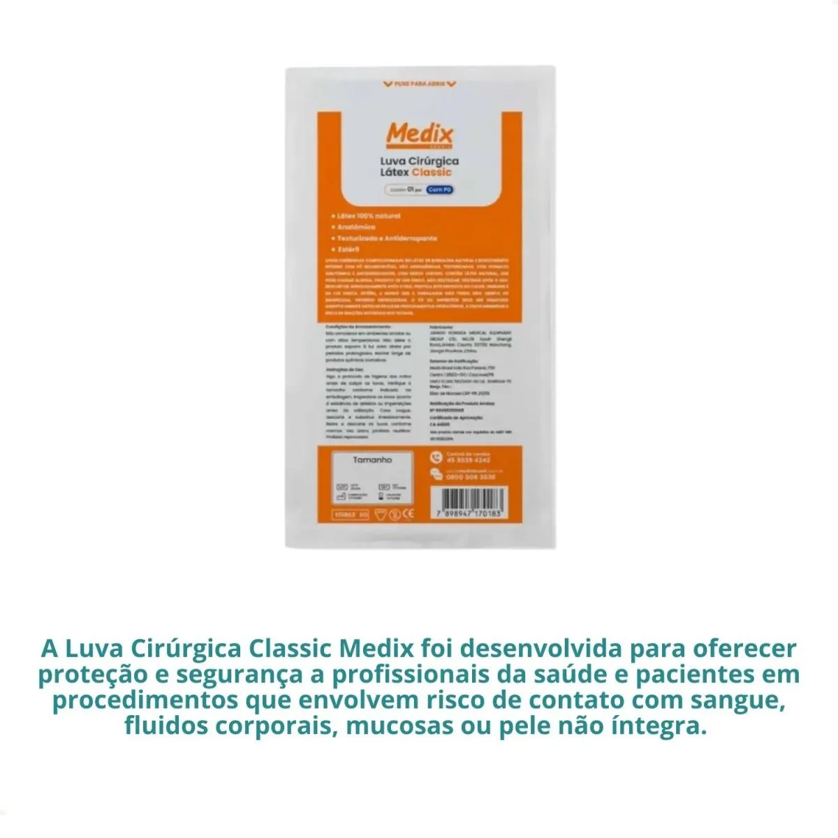 A Luva Cirúrgica Classic Medix foi desenvolvida para oferecer proteção e segurança a profissionais da saúde e pacientes em procedimentos que envolvem risco de contato com sangue, fluidos corporais, mucosas ou pele não íntegra. É indicada para uso hospitalar, clínico, odontológico, laboratorial e procedimentos cirúrgicos que exigem barreira contra agentes biológicos. Fabricada em látex de borracha 100% natural, possui textura na palma, formato anatômico, pó interno de amido de milho bioabsorvível que facilita o calçamento, além de punho com acabamento enrolado, que aumenta a resistência e a segurança durante o uso.