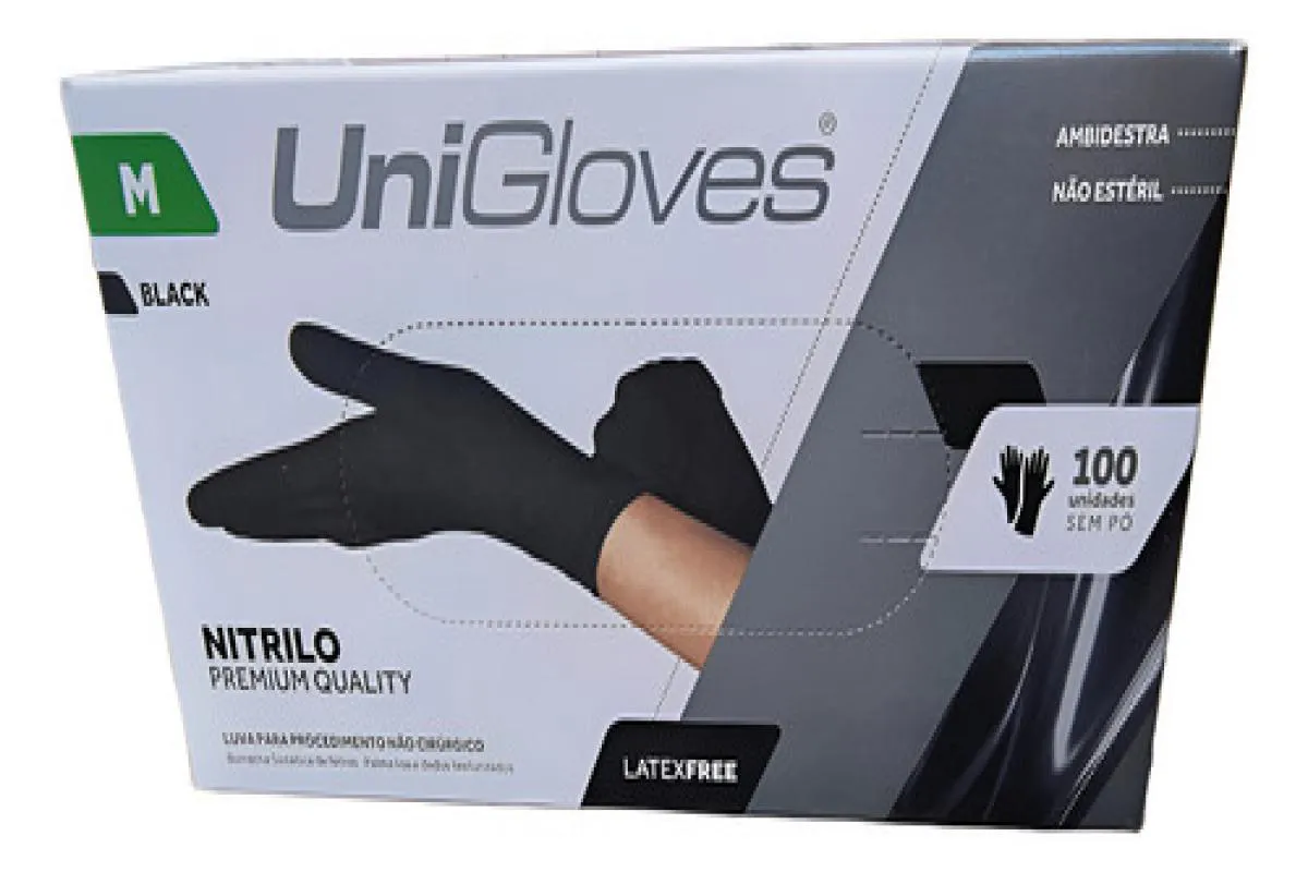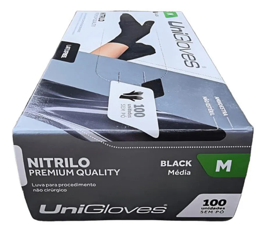Luva Descartável Nitrílica Unigloves sem Pó Preta Black 100U M Preto