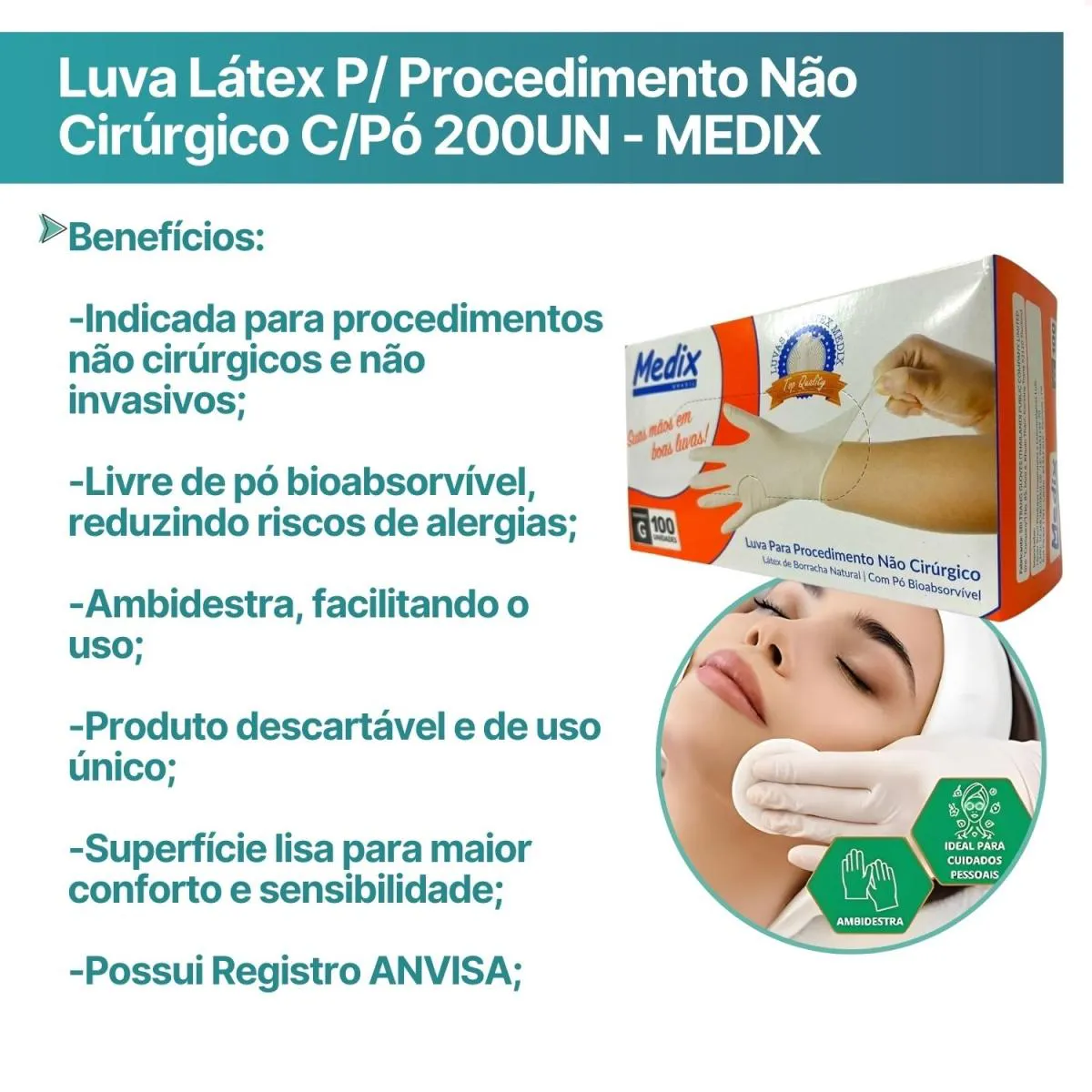 Desenvolvida com látex de borracha 100% natural, a Luva de Procedimento de Látex com Pó Medix é indicada para procedimentos não cirúrgicos, oferecendo conforto, praticidade e segurança durante o uso profissional.