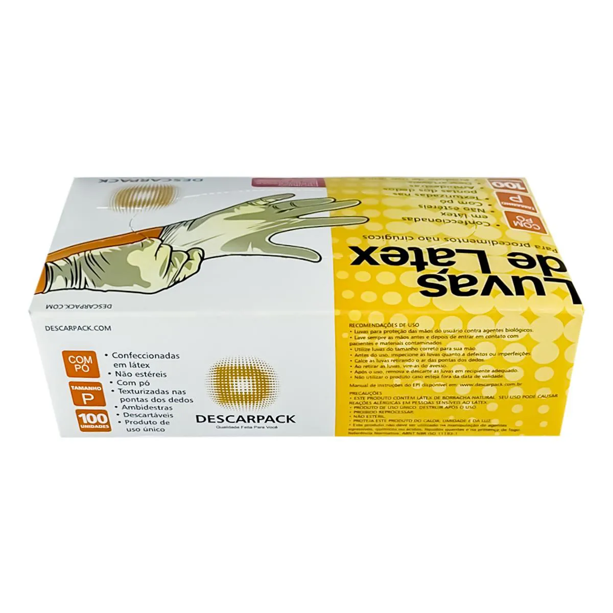 LUVA LÁTEX PARA USO PROFISSIONAL GERAL NÃO MÉDICO COM PÓ DESCARPACK COR BRANCO – CAIXA COM 100 UNIDADES A Luva de Látex para Uso Geral Não Médico Descarpack é uma opção prática e segura para diversas atividades profissionais que exigem proteção e higiene. Indicada para uso em áreas como limpeza, estética, manipulação de alimentos e outras tarefas de rotina, essa luva é fabricada com látex de alta qualidade e possui pó interno, facilitando o calçamento e garantindo maior conforto durante o uso prolongado. Esse modelo ideal para quaisquer profissional proporcionando ajuste ergonômico e flexibilidade, que permitem movimentos precisos e confortáveis. A cor branca reforça a aparência de limpeza e cuidado, sendo adequada para ambientes que demandam higiene, mas não possuem exigências médicas específicas. Esse produto é livre de registro na ANVISA, pois não é categorizado como um dispositivo médico, o que o torna uma alternativa versátil para uso profissional geral. Cada caixa contém 100 unidades, oferecendo excelente custo-benefício para quem busca uma solução de qualidade em proteção e praticidade. A Luva de Látex para Uso Profissional Geral com Pó Descarpack é a escolha certa para quem precisa de uma luva segura e confortável para atividades cotidianas, garantindo proteção e conveniência em um único produto.