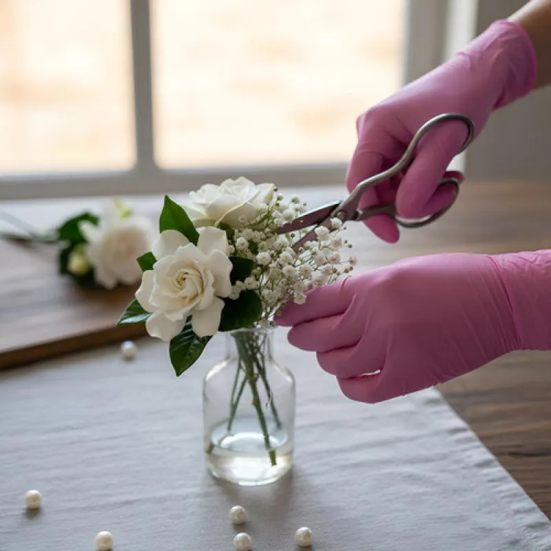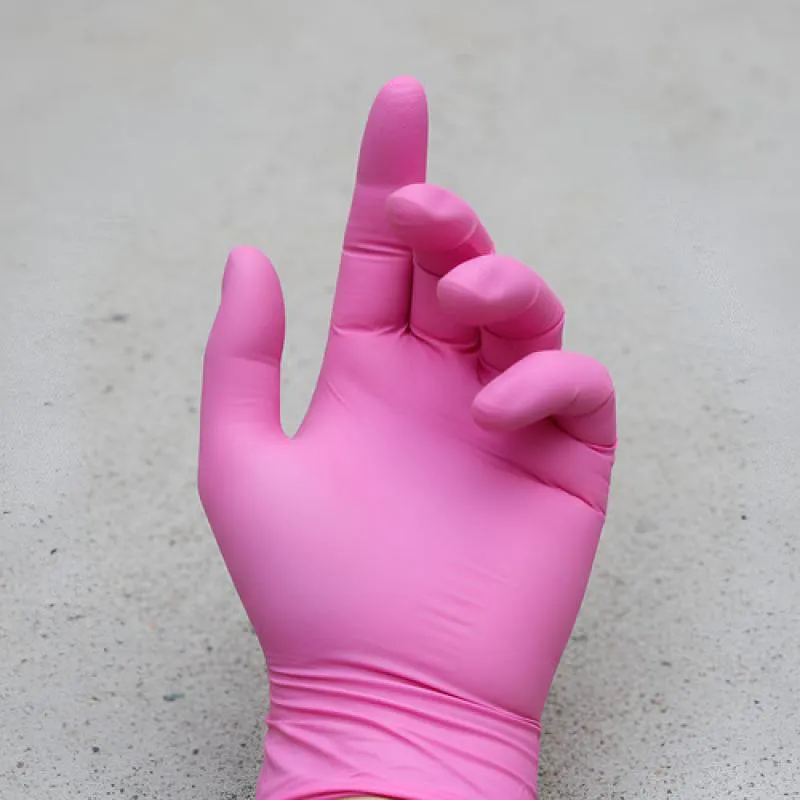 Luva de segurança para proteção das mãos confeccionada em borracha nitrílica, na cor Rosa, sem pó, ambidestra, com bainha, não estéril, superfície lisa e dedos texturizados