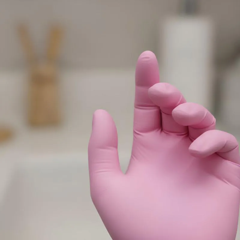 Luva de segurança para proteção das mãos confeccionada em borracha nitrílica, na cor Rosa, sem pó, ambidestra, com bainha, não estéril, superfície lisa e dedos texturizados