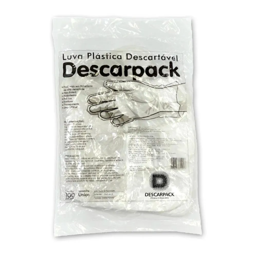 A luva plástica não estéril descartável Descarpack é transparente, ambidestra, atóxica e inodora.