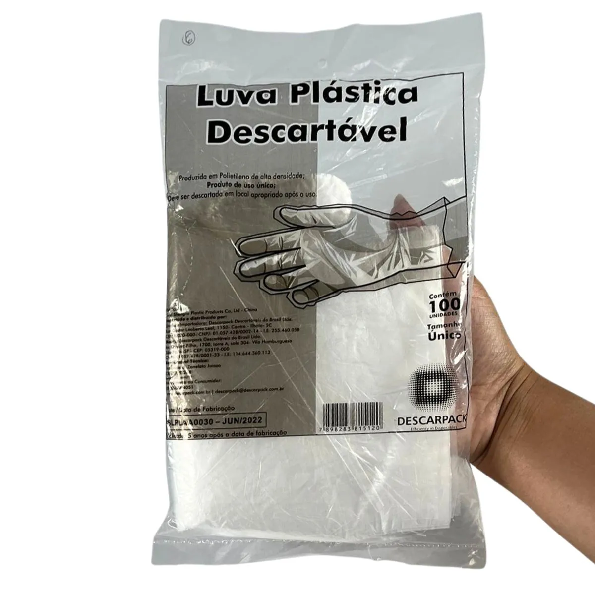 As luvas plásticas são equipamentos de proteção individual descartáveis, fabricadas em material plástico transparente, com tamanho único e projetadas para oferecer uma barreira higiênica temporária. São produzidas pela marca Descarpack em pacotes com 100 unidades, com design que permite ajuste confortável em diferentes tamanhos de mão.