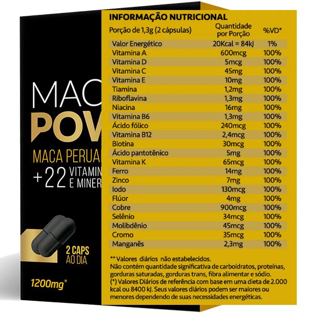 Maca peruana em pó, ácido fólico, biotina, cobre, cromo, ferro, flúor, iodo, manganês, molibdênio, selênio, vitamina A, vitamina B12, vitamina B1, vitamina B2, vitamina B3, vitamina B5, vitamina B6, vitamina c, vitamina D3, vitamina e, vitamina K1, zinco, excipiente: silicato de magnésio, antiumectante: dióxido de silício, cápsula: gelatina e corantes: amarelo 6, azorrubina, azul brilhante e dióxido de titânio. NÃO CONTÉM GLÚTEN E LACTOSE.