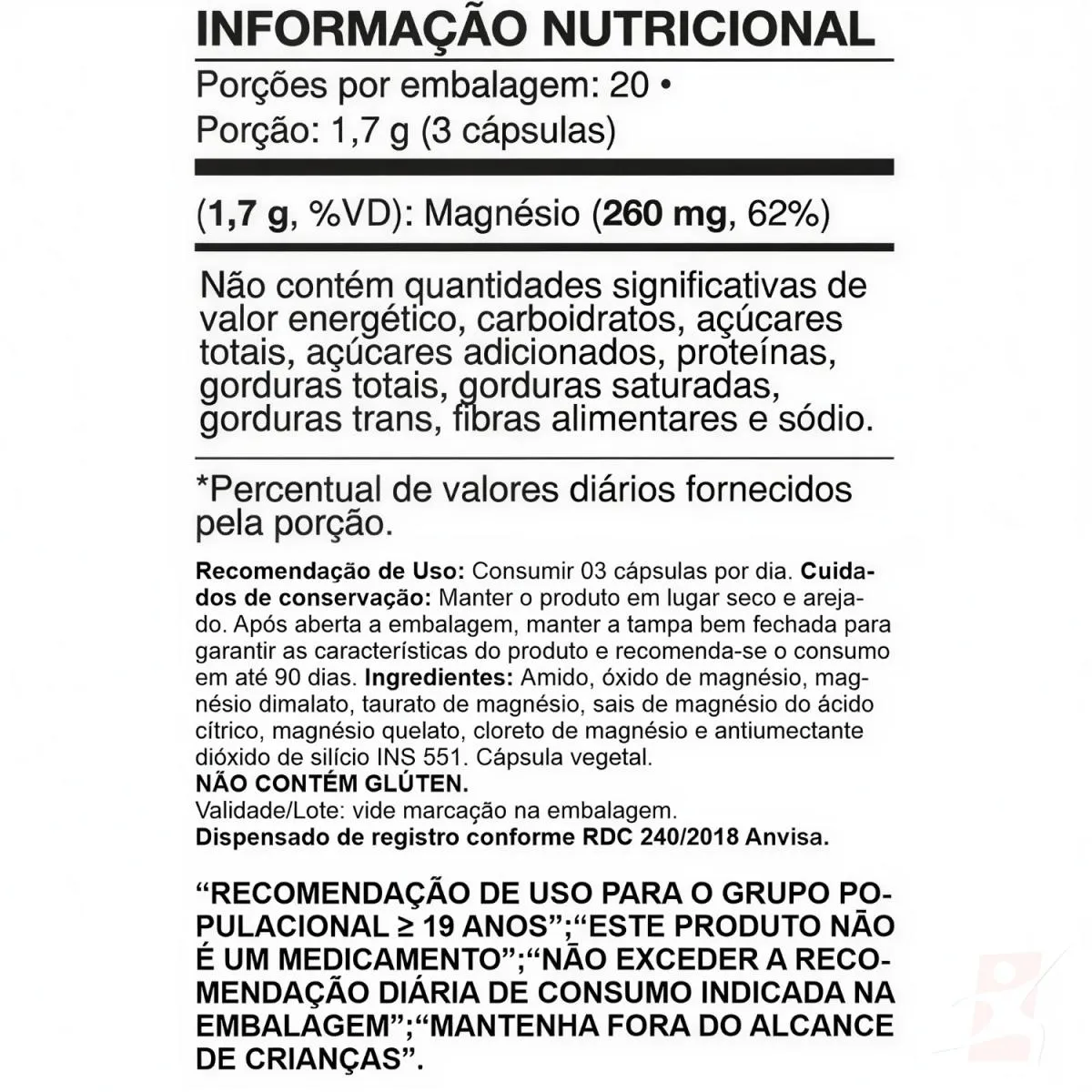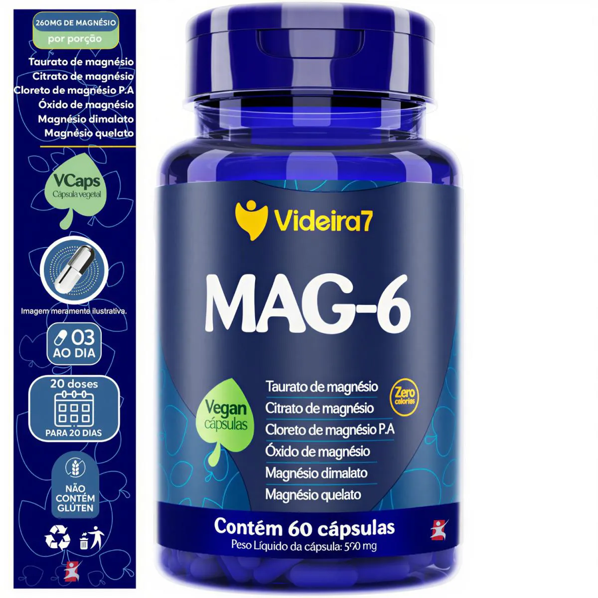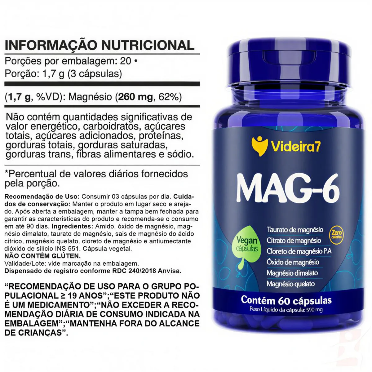 MAG-6 - MIX COM 6 MAGNÉSIOS: TAURATO+CITRATO+PA+ÓXIDO+DIMALATO+QUELATO 60 CÁPSULAS – VIDEIRA 7   DESCRIÇÃO 6 Formas de Magnésio em uma única formulação e ainda embalado em cápsula vegana. O blend mais completo do mercado. Com Taurato de Magnésio, Citrato de Magnésio, Cloreto de Magnésio P.A, Óxido de Magnésio, Magnésio Dimalato e Magnésio Quelato.   BENEFÍCIOS - Cápsula vegana; - Taurato de Magnésio; - Citrato de Magnésio; - Cloreto de Magnésio P.A; - Óxido de Magnésio; - Magnésio Dimalato; - Magnésio Quelato; - Zero calorias;   SUGESTÃO DE USO Consumir 3 cápsulas por dia.   TABELA NUTRICIONAL - COMPOSIÇÃO & RECOMENDAÇÕES Anexo nas imagens do anúncio.   DADOS TÉCNICOS Registro na ANVISA – Dispensado de registro conforme RDC 240/2018. MARCA – Videira 7. Conteúdo líquido por frasco – 60 cápsulas. Rendimento por frasco – 20 doses/porções. Peso líquido por frasco – 33g. Peso bruto por frasco – 100g. Peso aproximado produto + embalagem – 150g. Código de barras (EAN) – 7898632773002. Dimensões do produto – largura: 6cm; altura: 10cm; comprimento: 6cm. Dimensões da embalagem de envio – largura: 13cm; altura: 7cm; Comprimento: 16cm.   ITENS DO ANÚNCIO 1 unidade do produto: MAG-6 - MIX COM 6 MAGNÉSIOS: TAURATO+CITRATO+PA+ÓXIDO+DIMALATO+QUELATO 60 CÁPSULAS – VIDEIRA 7. Total: 60 Cápsulas POR FRASCO.
