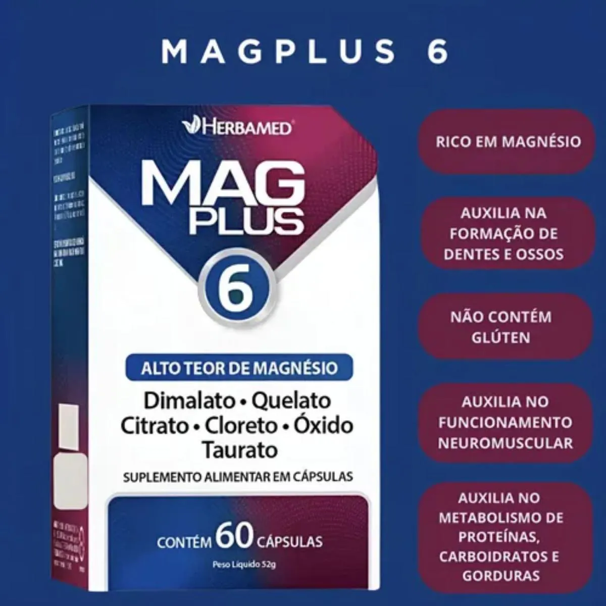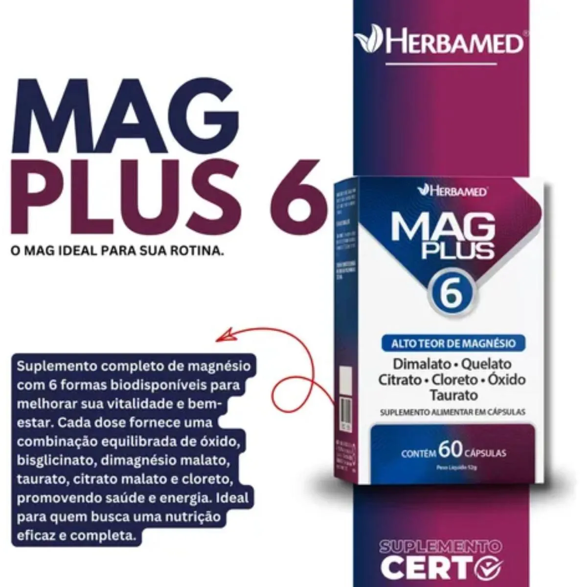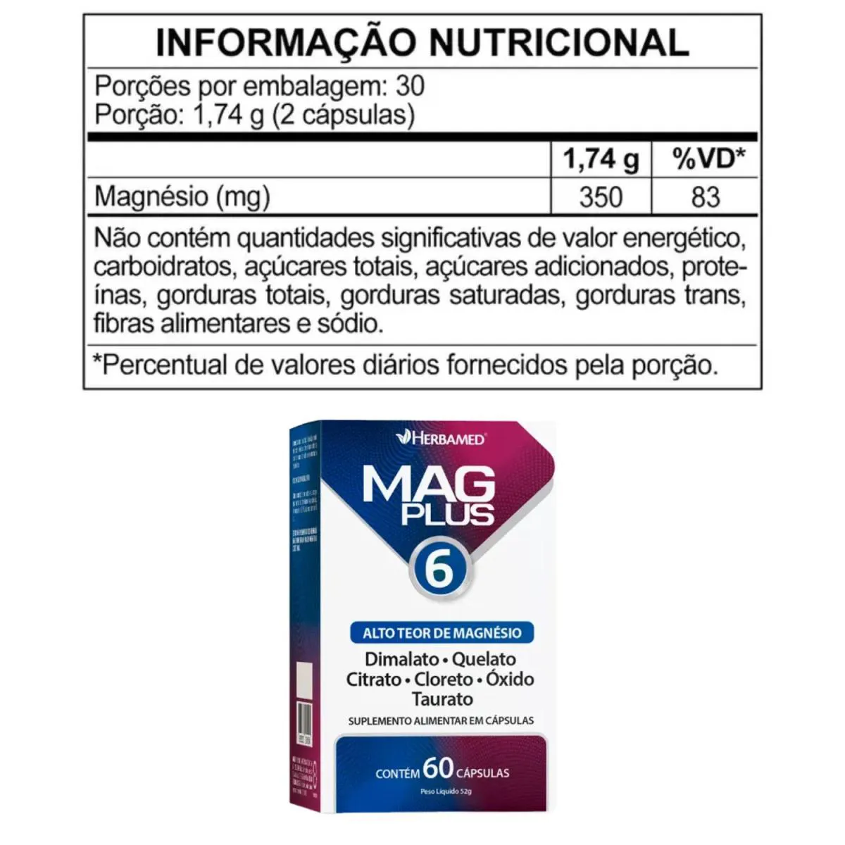 Mag Plus 6 Magnésio C60 Herbamed É um suplemento alimentar em cápsulas com seis formas de magnésio, que auxilia no funcionamento muscular e neuromuscular, contribuindo para mais equilíbrio e bem-estar no dia a dia. Diferenciais: · Fórmula com 6 tipos de magnésio · Auxilia na função muscular · Contribui para reduzir cansaço e fadiga · Apoia a saúde óssea · Uso diário e prático Modo de uso: