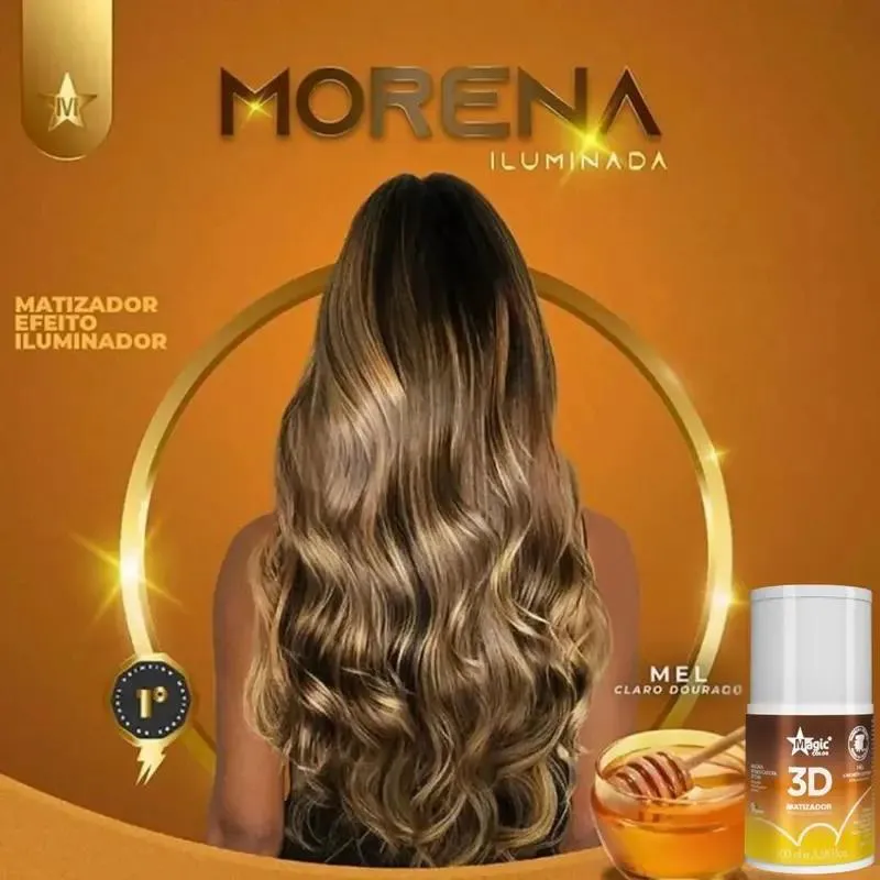 MAGIC COLOR GLOSS MATIZADOR 3D MORENA ILUMINADA MEL 100ML O Magic Color Gloss Matizador 3D Morena Iluminada Mel 100ml é uma máscara revitalizante desenvolvida para realçar e iluminar cabelos castanhos claros dourados ou com mechas em tons de mel, proporcionando brilho e maciez.