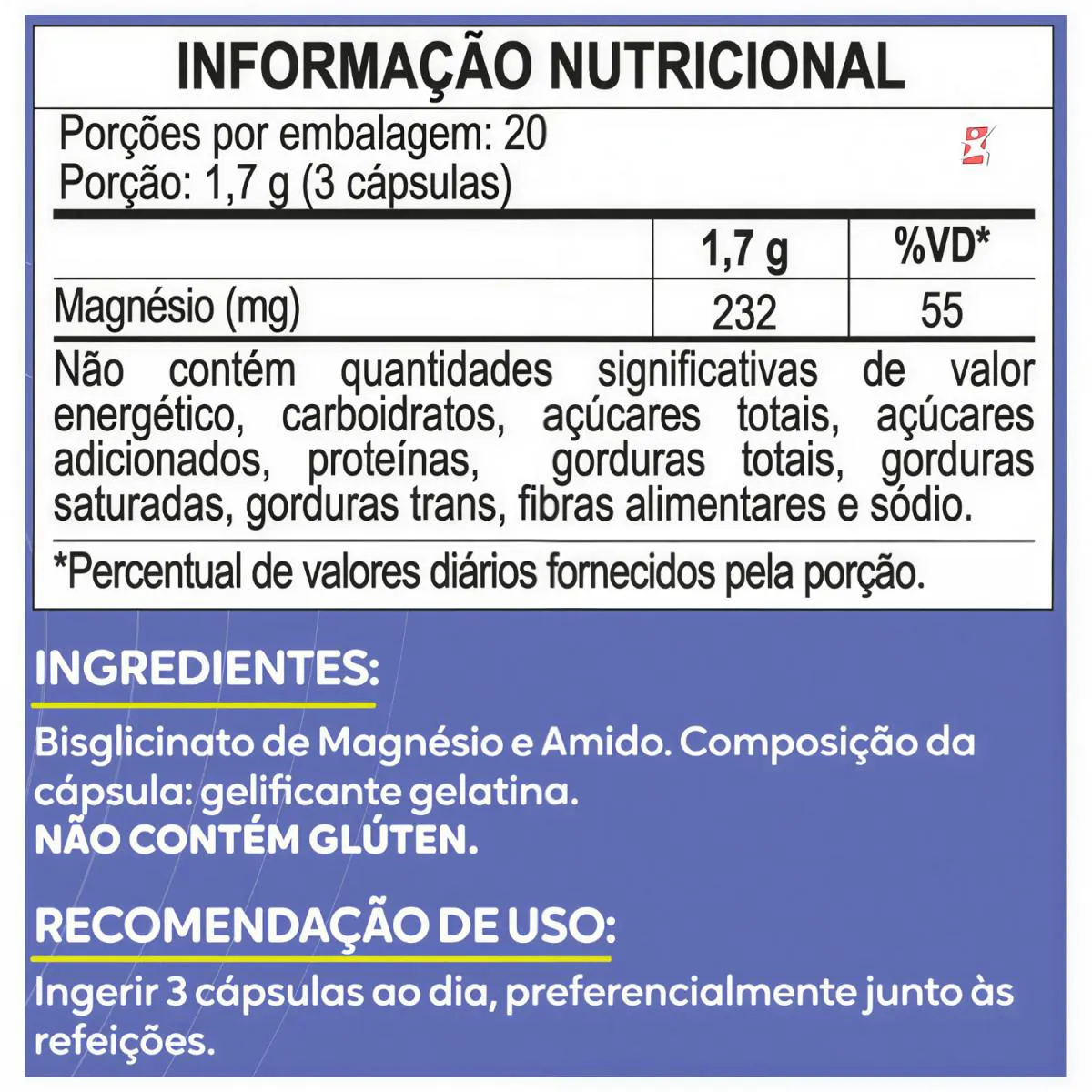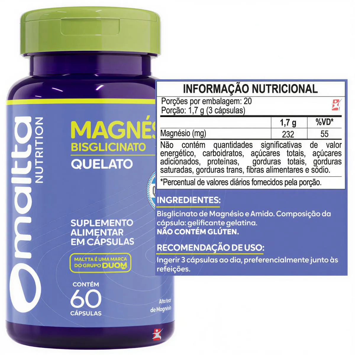 MAGNÉSIO BISGLICINATO QUELATO AUTÊNTICO QUELATO NPA® 60 CÁPSULAS - MALTTA NUTRITION DESCRIÇÃO O Magnésio participa em mais de 350 reações enzimáticas no organismo humano. Auxilia na formação de ossos e dentes, no metabolismo energético de proteínas, de carboidratos e de gorduras. O magnésio auxilia no funcionamento muscular e neuromuscular e no equilíbrio de eletrólitos. A forma “quelato” se refere a uma ligação com um aminoácido. No magnésio, o aminoácido serve para facilitar a absorção do mineral, e desse modo o corpo aproveita todos os benefícios do nutriente. O Magnésio quelato é o magnésio associado a glicina. O Magnésio auxilia na formação dos ossos e dentes, no metabolismo energético, de proteínas, carboidratos e gorduras, no equilíbrio de eletrólitos, no funcionamento muscular e neuromuscular e no processo de divisão celular. BENEFÍCIOS - Participa em mais de 350 reações enzimáticas no organismo; - Mineral essencial; - Metabolismo energético; - Funcionamento muscular e neuromuscular; - Equilíbrio de eletrólitos; - Bisglicinato de magnésio; - Apenas 3 cápsulas ao dia; - 232mg de magnésio por dose/porção; SUGESTÃO DE USO Ingerir 3 cápsulas ao dia. TABELA NUTRICIONAL - COMPOSIÇÃO - RECOMENDAÇÕES & CUIDADOS Anexo nas imagens do anúncio. DADOS TÉCNICOS Marca – Duom: MALTTA NUTRITION. Conteúdo líquido total – 60 cápsulas. Rendimento total – 20 porções/doses. Peso líquido total – 34g. Peso bruto total – 70g. Peso aproximado produto + embalagem - 150g. Código de barras (EAN) – 7898665750193. Registro ANVISA – Produto de acordo com a RDC 27/2010 e RDC 240/2018. Dimensões do produto – largura: 6 cm; altura: 11 cm; comprimento: 6 cm. Dimensões da embalagem/pacote - largura: 13 cm; altura: 7 cm; comprimento: 16 cm. ITENS DO ANÚNCIO 1 Unidade do produto: MMAGNÉSIO BISGLICINATO QUELATO AUTÊNTICO QUELATO NPA® 60 CÁPSULAS - MALTTA NUTRITION. Total – 60 cápsulas POR FRASCO.