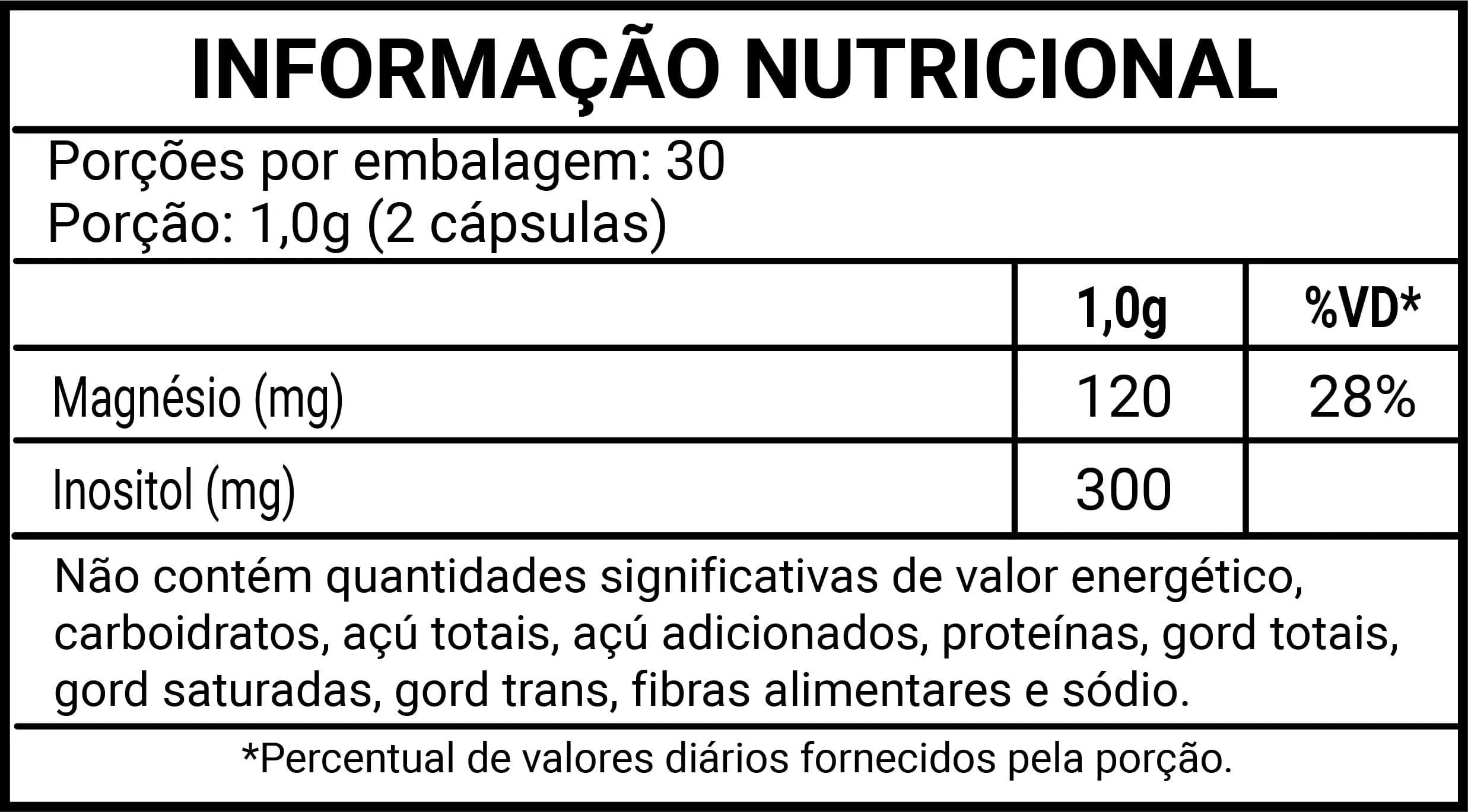Mio inositol, bisglicinato de magnésio, antiumectantes (dióxido de silício, silicato de magnésio e estearato de magnésio).