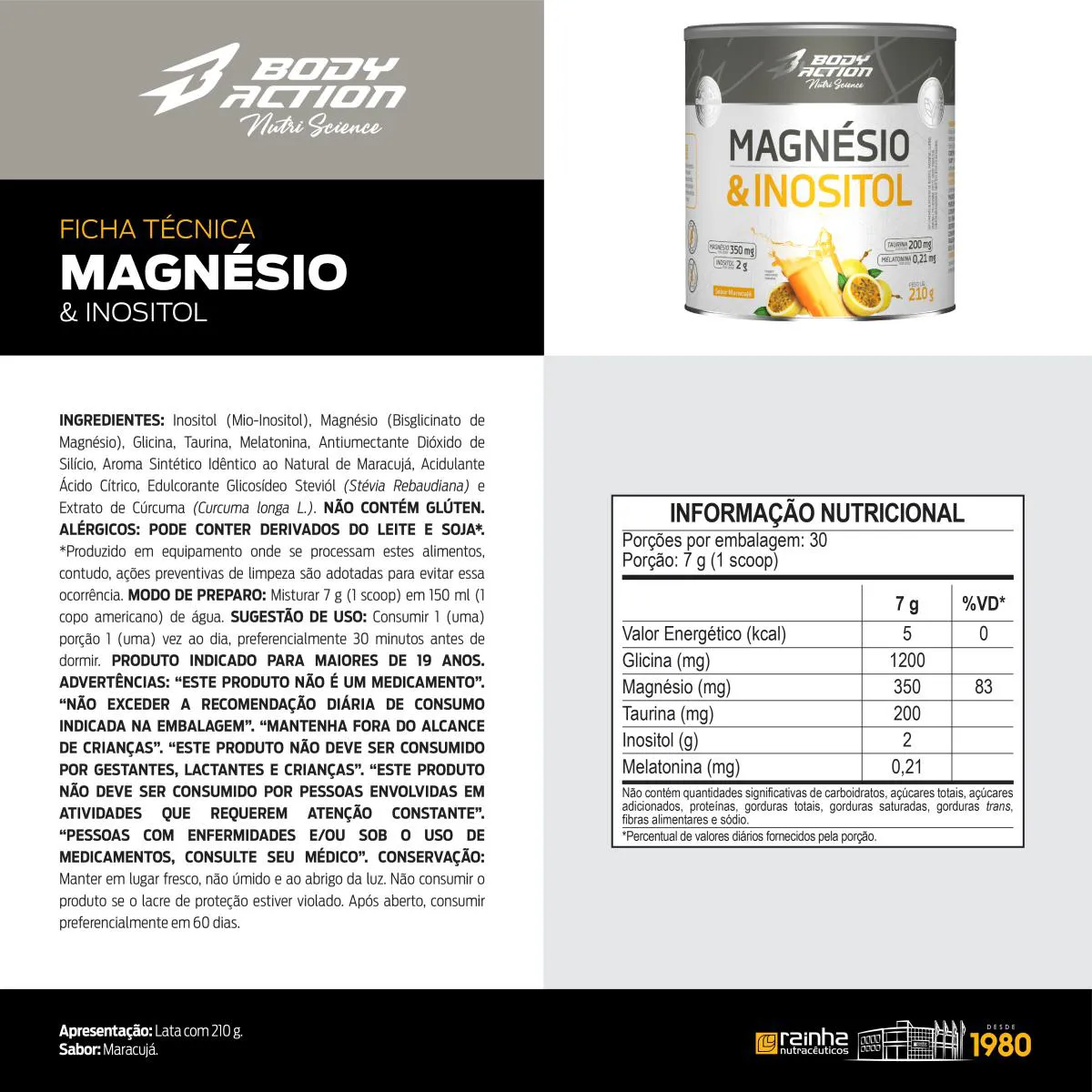 MAGNÉSIO E INOSITOL INGREDIENTES: Inositol (Mio-Inositol), Magnésio (Bisglicinato de Magnésio), Glicina, Taurina, Melatonina, Antiumectante, Aroma Sintético Idêntico ao Natural de Frutas Vermelhas, Acidulante Ácido Cítrico, Edulcorante Glicosídeo Steviól (Stévia Rebaudiana) e Corante Carmim. NÃO CONTÉM GLÚTEN. ALÉRGICOS: PODE CONTER DERIVADOS DO LEITE E SOJA*. *Produzido em equipamento onde se processam estes alimentos, contudo, ações preventivas de limpeza são adotadas para evitar essa ocorrência. (Frutas Vermelhas) MODO DE PREPARO: Misturar 7 g (1 scoop) em 150 ml (1 copo americano) de água. SUGESTÃO DE USO: Consumir 1 (uma) porção 1 (uma) vez ao dia, preferencialmente 30 minutos antes de dormir. PRODUTO INDICADO PARA MAIORES DE 19 ANOS. ADVERTÊNCIAS: “ESTE PRODUTO NÃO É UM MEDICAMENTO”. “NÃO EXCEDER A RECOMENDAÇÃO DIÁRIA DE CONSUMO INDICADA NA EMBALAGEM”. “MANTENHA FORA DO ALCANCE DE CRIANÇAS”. “ESTE PRODUTO NÃO DEVE SER CONSUMIDO POR GESTANTES, LACTANTES E CRIANÇAS”. “ESTE PRODUTO NÃO DEVE SER CONSUMIDO POR PESSOAS ENVOLVIDAS EM ATIVIDADES QUE REQUEREM ATENÇÃO CONSTANTE”. “PESSOAS COM ENFERMIDADES E/OU SOB O USO DE medicamentos, CONSULTE SEU MÉDICO.” CONSERVAÇÃO: Manter em lugar fresco, não úmido e ao abrigo de luz. Não consumir o produto se o lacre de proteção estiver violado. Após aberto, consumir preferencialmente em 60 dias.