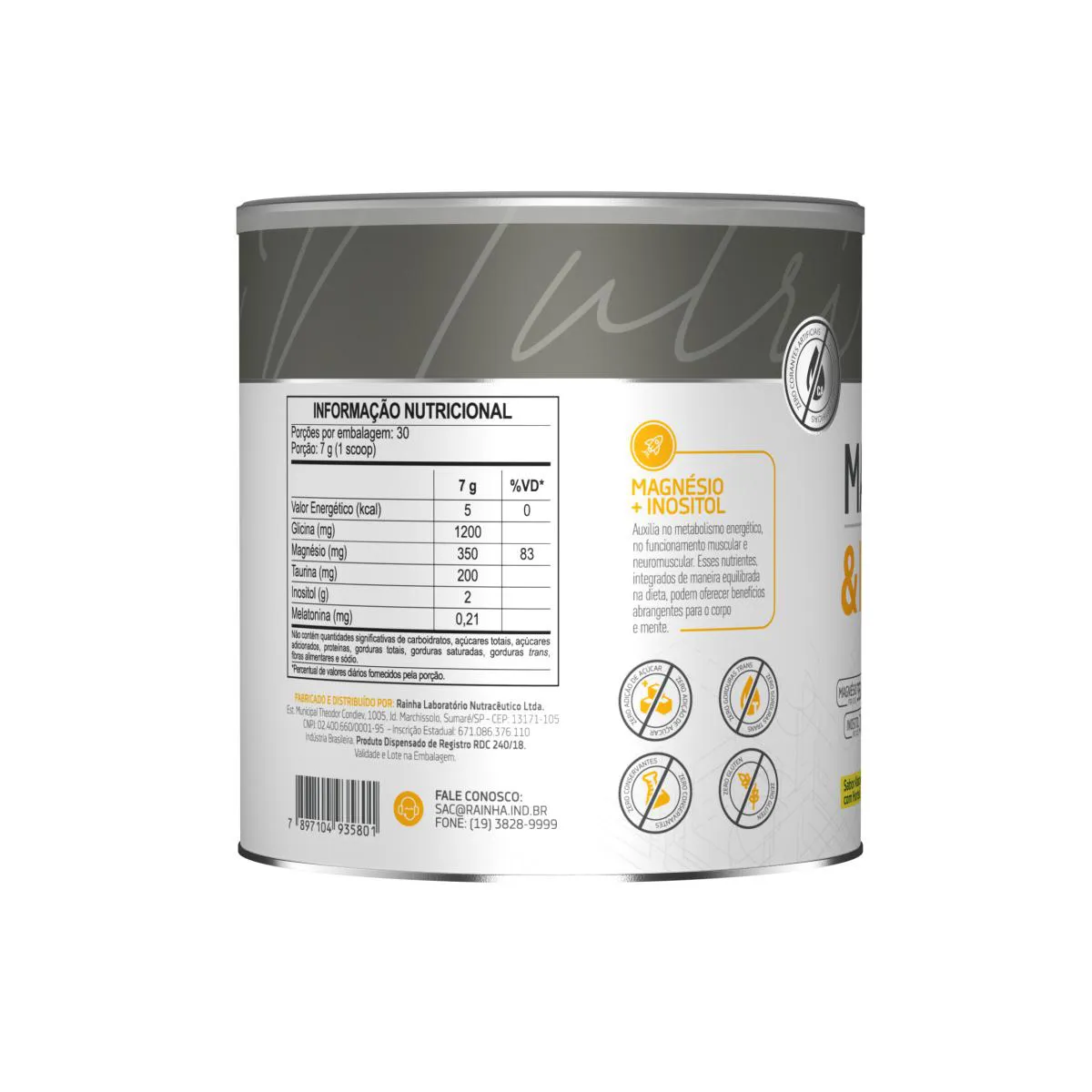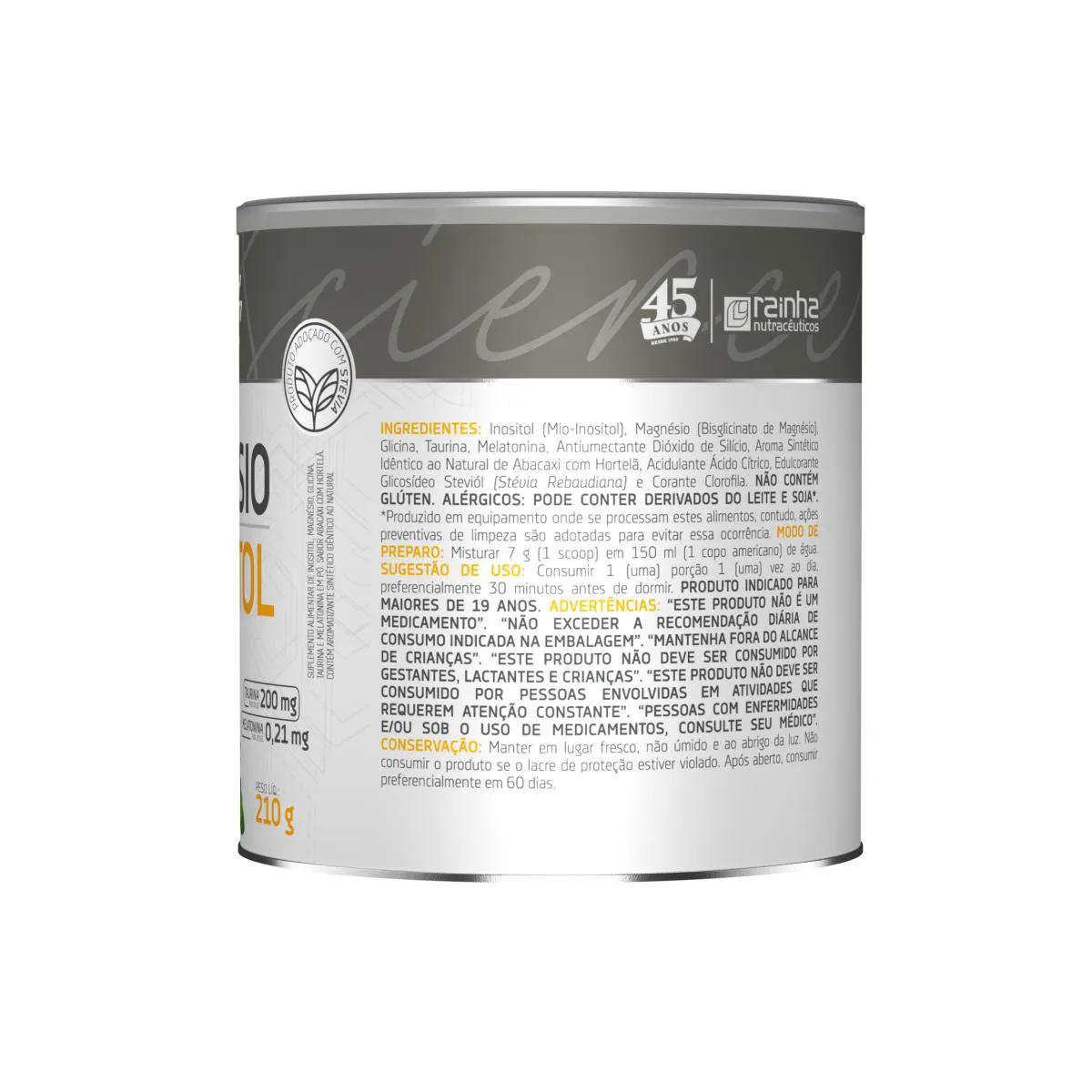 INGREDIENTES: Inositol (Mio-Inositol), Magnésio (Bisglicinato de Magnésio), Glicina, Taurina, Melatonina, Antiumectante Dióxido de Silício, Aroma Sintético Idêntico ao Natural de Maracujá, Acidulante Ácido Cítrico, Edulcorante Glicosídeo Steviól (Stévia Rebaudiana) e Extrato de Cúrcuma (Curcuma longa L.). NÃO CONTÉM GLÚTEN. ALÉRGICOS: PODE CONTER DERIVADOS DO LEITE E SOJA*. *Produzido em equipamento onde se processam estes alimentos, contudo, ações preventivas de limpeza são adotadas para evitar essa ocorrência.