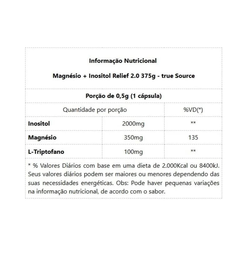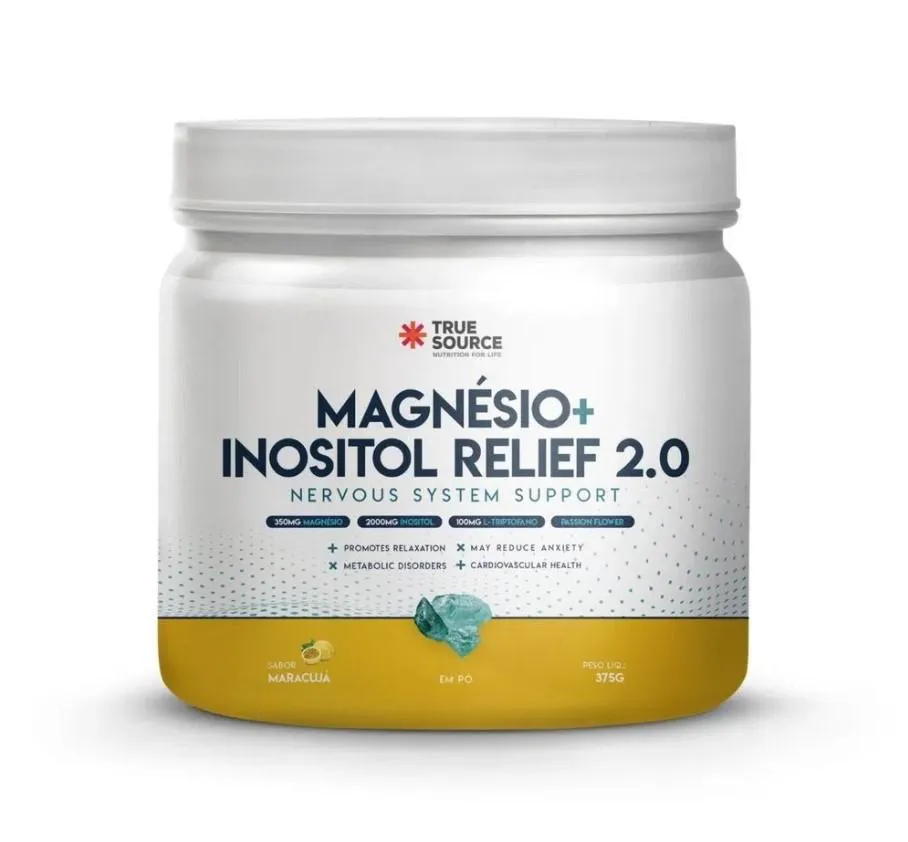 Magnésio + Inositol Relief 2.0 (375g) O que era bom ficou ainda melhor! Agora nosso querido Magnésio Inositol Relief vem na versão maracujá com passion flower e L-triptofano para quem procura relaxamento e melhora do sono! Nosso produto conta com 100mg de L-Triptofano e passion flower, que proporciona uma maior liberação de serotonina, neurotransmissor responsável pela sensação de bem-estar, satisfação e felicidade. Quando você tem uma adequada liberação de serotonina, naturalmente você produz mais melatonina, melhorando ainda mais seu sono e fazendo ele ser reparador. Estudos também mostram que quando você tem níveis adequados de serotonina, você tende a ter menos vontade de doces, principalmente final do dia, que é quando há uma queda desse neurotransmissor. Então o Magnésio Inositol 2.0 lhe ajudará a diminuir episódios de compulsões alimentares. Agora, você terá um produto ainda mais completo! BENEFÍCIOS: - 2g de inositol por dose;- Fórmula clean sem corantes, aromas e adoçantes artificiais;- Zero glúten, açúcar e lactose;- Promove o relaxamento;- Melhora a qualidade do sono;- Saúde cardiovascular.