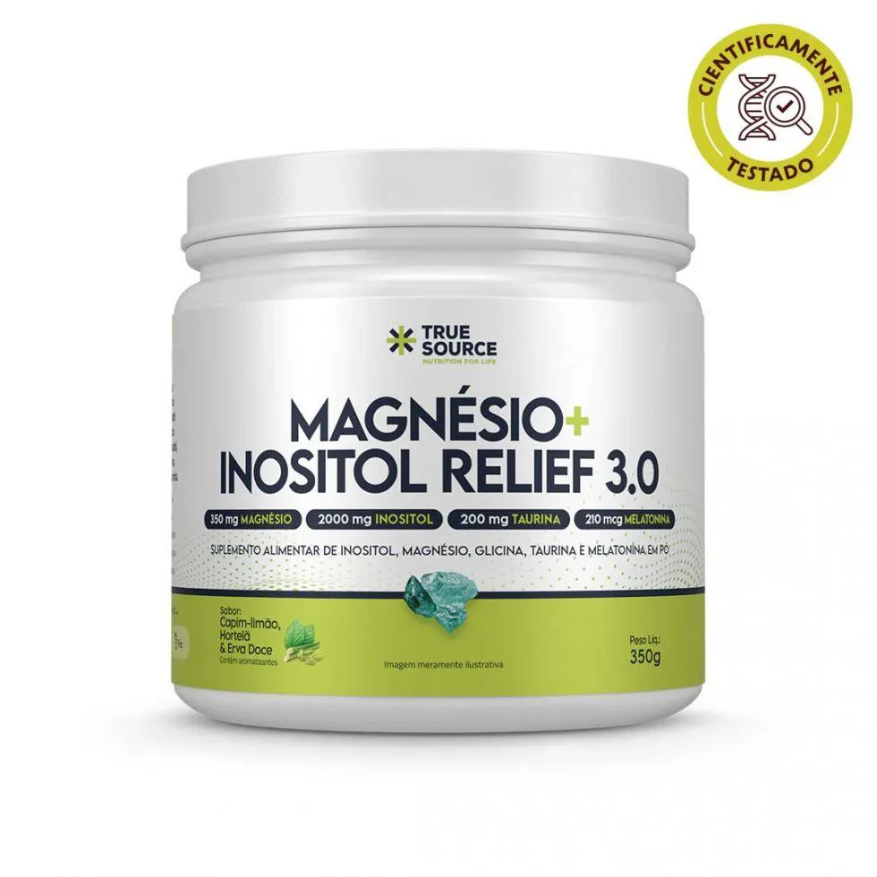 Magnésio + Inositol Relief 3.0 (350g) Nosso suplemento combina dois componentes essenciais para o bom funcionamento do organismo: Magnésio é um mineral que participa de mais de 300 reações metabólicas no corpo humano, é importante para saúde óssea, muscular, cardiovascular, intestinal, assim como na saúde do sistema nervoso central. Carências desse mineral podem acarretar diversos prejuízos a saúde. Já o inositol é um componente que faz parte da família das vitaminas do complexo B. Está presente na membrana das células, principalmente as células do sistema nervoso central, otimizando a comunicação entre os neurônios. A combinação do magnésio com o inositol auxilia na ossos e dentes, funcionamento muscular, no funcionamento neuromuscular, no metabolismo energético, no equilíbrio de eletrólitos e no processo de divisão celular. Magnésio + Inositol Relief sabor Camomila, Laranja e Lavanda, agora trazendo um toque cítrico na formulação. Benefícios: - 350mg de Magnésio;- 2000mg de Inositol;- 200mg de Taurina;- 210mcg de Melatonina;- Magnésio na forma de bisglicinato, maior absorção;- Fórmula clean: sem corantes, aromas e adoçantes artificiais;- Zero açúcar, glúten e lactose.