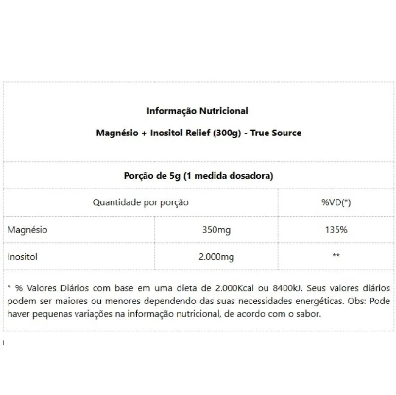 Magnésio + Inositol Relief (300g) Nosso suplemento combina dois componentes essenciais para o bom funcionamento do organismo: Magnésio é um mineral que participa de mais de 300 reações metabólicas no corpo humano, é importante para saúde óssea, muscular, cardiovascular, intestinal, assim como na saúde do sistema nervoso central. Carências desse mineral podem acarretar diversos prejuízos à saúde, principalmente aqueles relacionados ao relaxamento e bem estar.