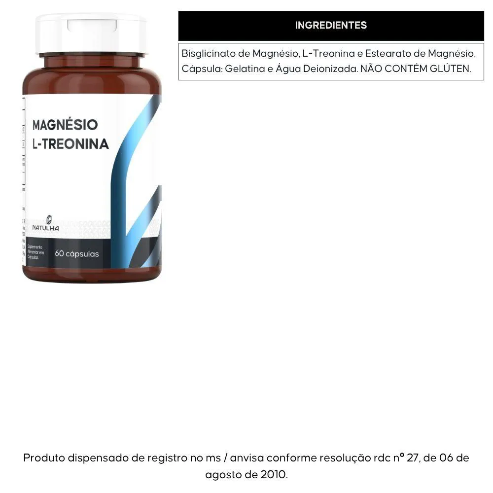 Bisglicinato de Magnésio, L-Treonina e Estearato de Magnésio. Cápsula: Gelatina e Água Deionizada. NÃO CONTÉM GLÚTEN.