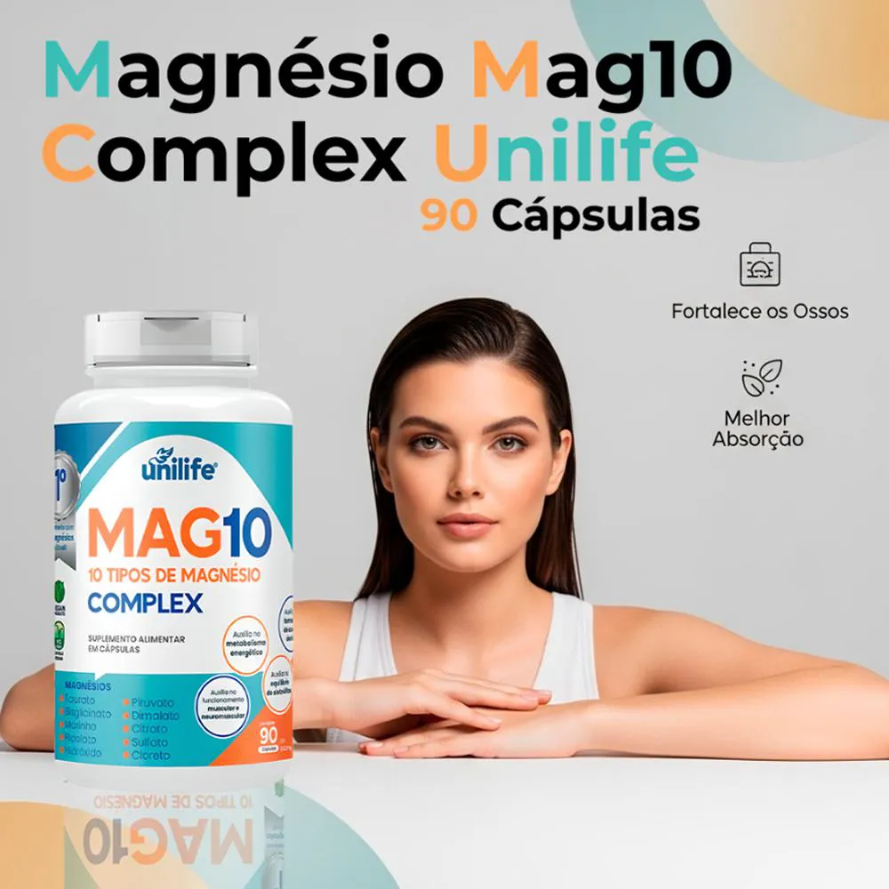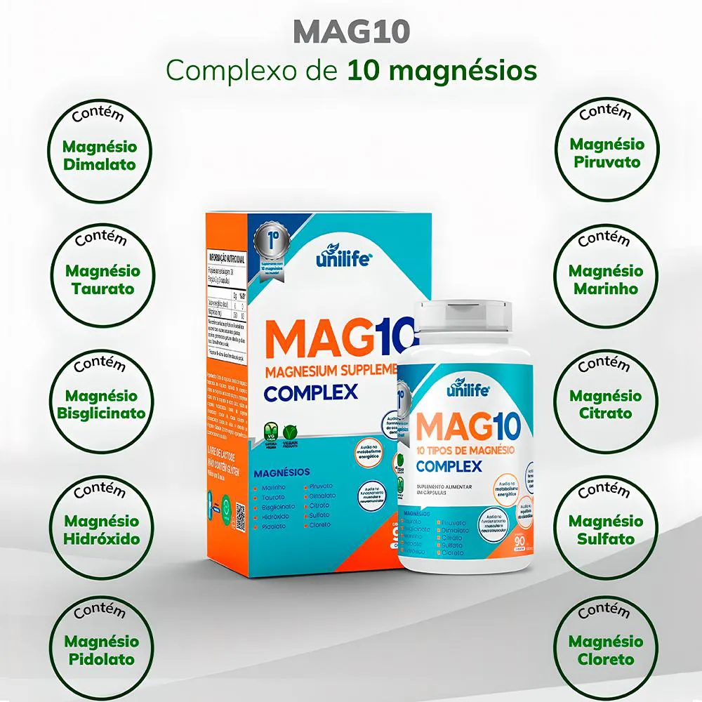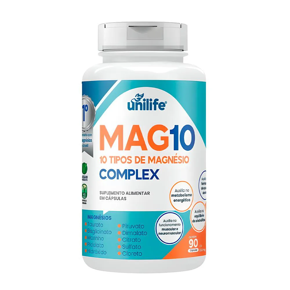 O Magnésio Mag10 Complex é um suplemento alimentar desenvolvido pela Unilife Vitamins, formulado com 10 tipos de magnésio de diferentes fontes — como taurato, bisglicinato, malato, citrato, pidolato e outras — que oferecem ampla variedade de sais minerais em uma única cápsula.