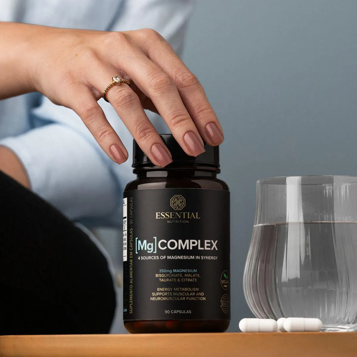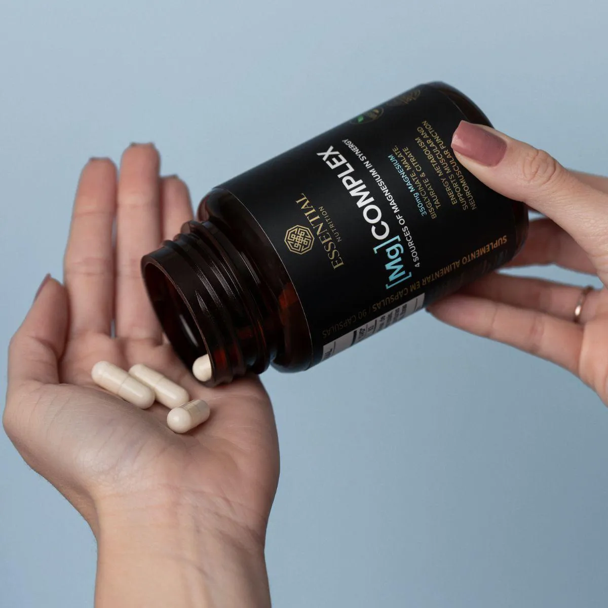 Os diferenciais deste complexo estão na variedade de sais de magnésio escolhidos para favorecer diferentes modos de absorção e na qualidade das matérias-primas certificadas. A Essential monitora cada lote para garantir pureza e solubilidade, reforçando sua reputação de transparência.