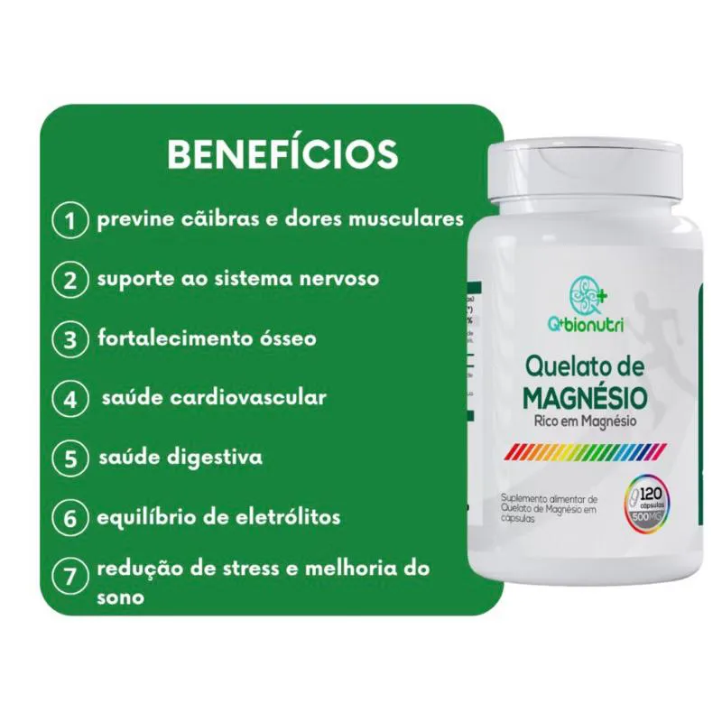 - Absorção Avançada: Formulado com magnésio quelatado, garantindo uma absorção otimizada pelo organismo. Suporte Muscular e Nervoso: Ajuda a regular a função muscular e nervosa, promovendo relaxamento e alívio do estresse. Saúde Óssea e Dental: Contribui para a saúde dos ossos e dentes, mantendo-os fortes e saudáveis. Metabolismo Saudável: Participa em processos metabólicos essenciais, auxiliando na produção de energia e na síntese de proteínas. Suporte Imunológico: Fortalece o sistema imunológico, ajudando o corpo a defender-se contra infecções e doenças.