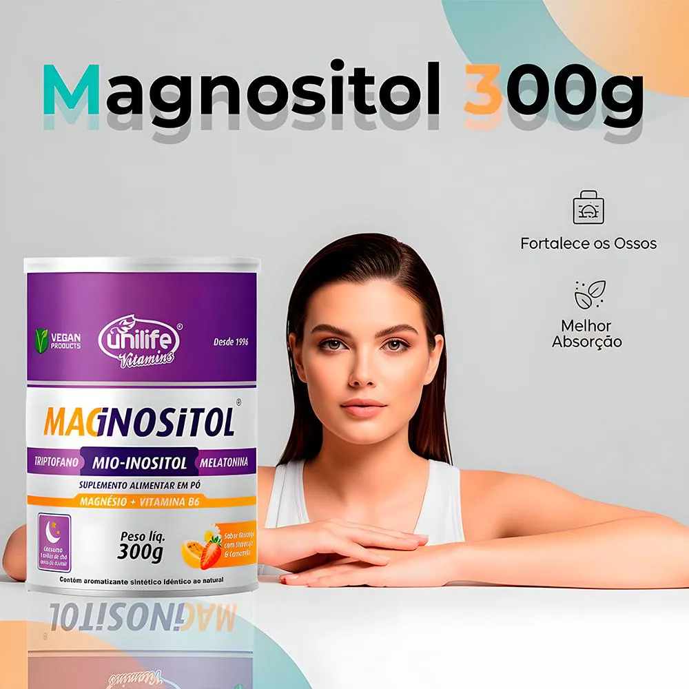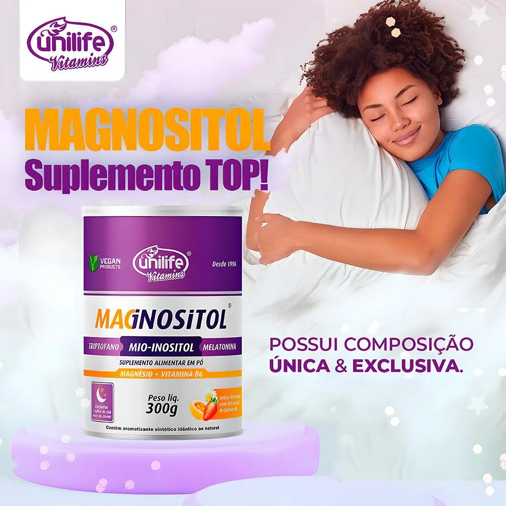 O Magnositol Unilife é um suplemento alimentar em pó com sabor agradável de maracujá, morango e camomila. Sua fórmula combina Magnésio, Inositol, triptofano, Melatonina e vitamina B6, nutrientes que contribuem para o equilíbrio do organismo e podem ser incluídos na rotina noturna.