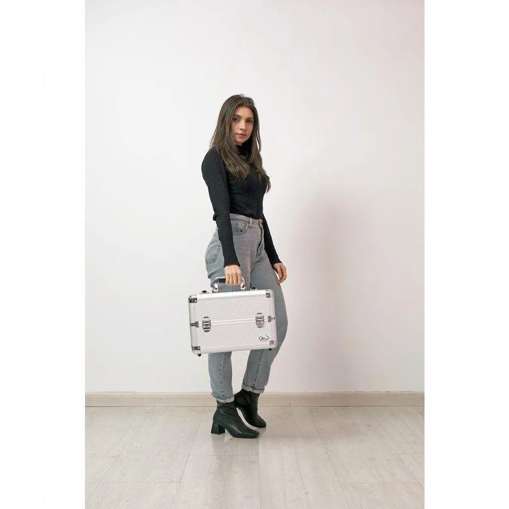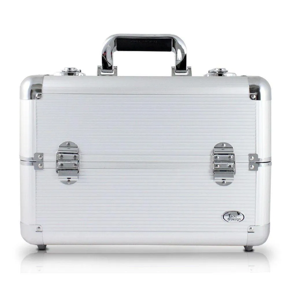 Maleta de Maquiagem Prata Jacki Design -A maleta para maquiagem da Jacki Design é feito de material de alumínio resistente, possui 1 par de chaves para maior , divisórias móveis e bandejas deslizantes para melhor organização. Perfeito para guardar makes, bijus e acessórios diversos. Ideal para o de beleza que procura praticidade e qualidade junto das composições forro de nylon e borracha e a parte externa de aluminio.Medidas: Comprimento: 36 cm x Largura 23cm x Altura 26 cm