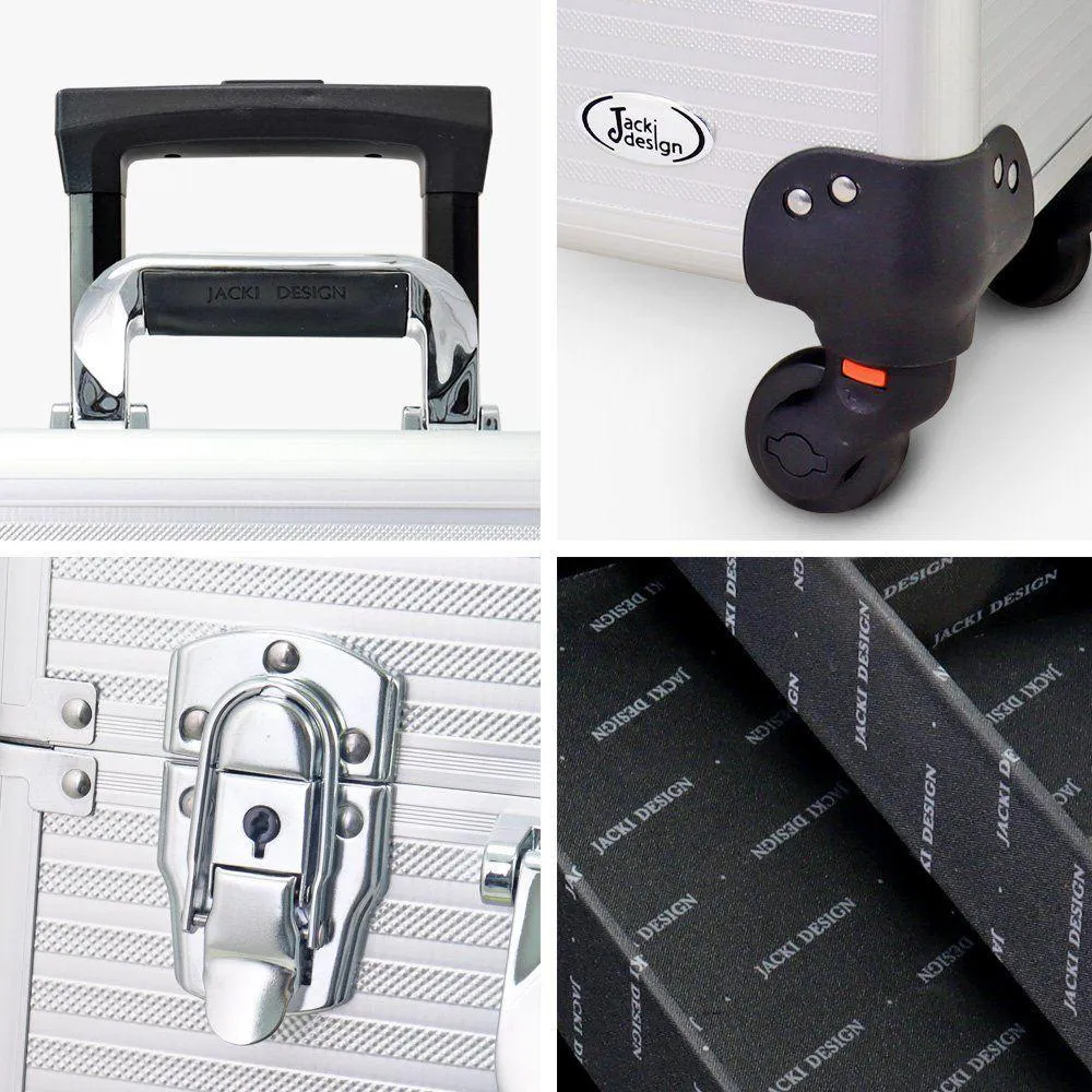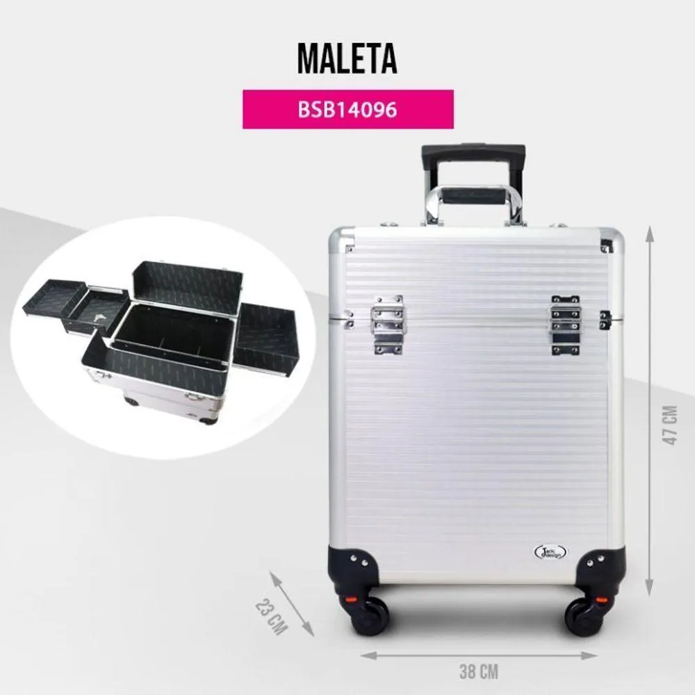É uma maleta profissional fabricada em alumínio resistente e ABS, projetada para armazenar e transportar maquiagem, bijuterias e acessórios diversos. Possui fecho em trave para segurança, divisórias móveis e bandejas deslizantes que facilitam a organização dos itens.