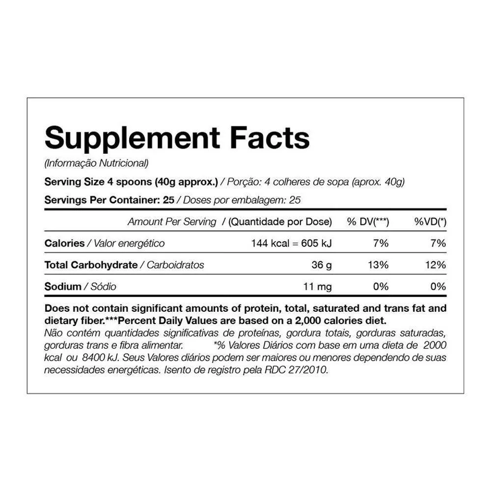 Informação Nutricional Maltodextrin Turbo 1kg - Black SkullPorção de 40g (4 colheres de sopa)Quantidade por porção%VD(*)Valor energético144kcal=605kj7%Carboidratos36g12%Sódio11mg0%* % Valores Diários com base em uma dieta de 2.000Kcal ou 8400kJ. Seus valores diários podem ser maiores ou menores dependendo das suas necessidades energéticas. Obs: Pode haver pequenas variações na informação nutricional, de acordo com o sabor.