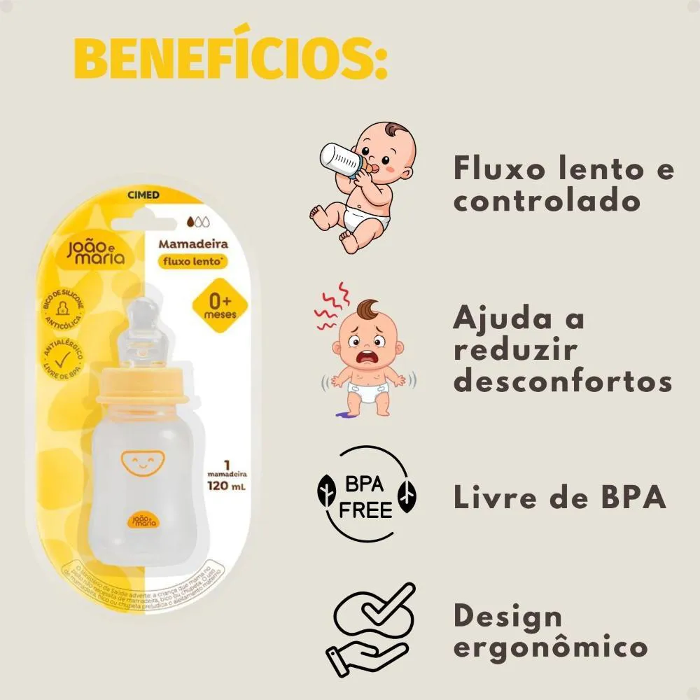 Mamadeira Fluxo Lento Cimed João e Maria Bico de Silicone 0+ Meses 120Ml