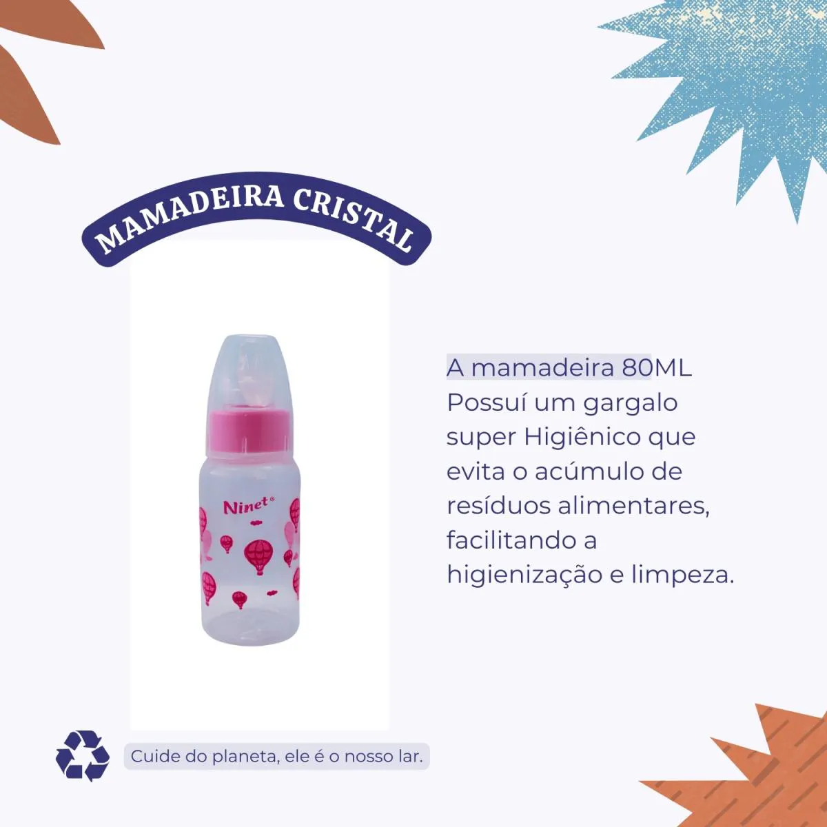 A Mamadeira Ninet é um recipiente para alimentação de bebês, compacto e higiênico, fabricado em polipropileno cristal, com capacidade de 80ml e bico mini redondo de silicone macio. Projetada especificamente para recém-nascidos, é livre de Bisfenol-A (BPA).