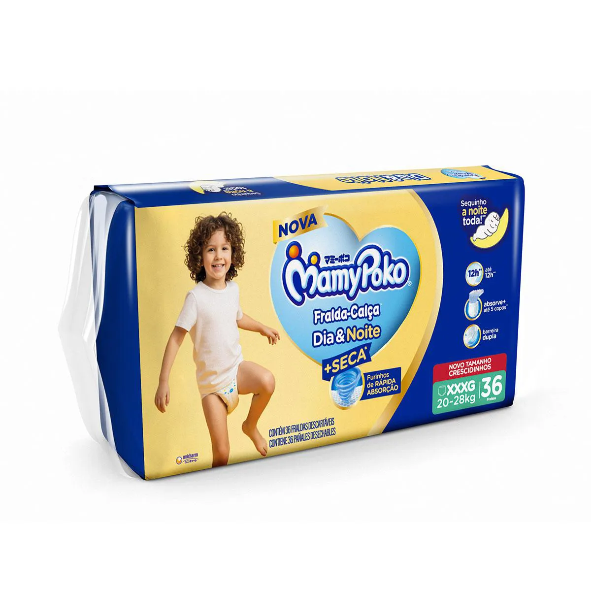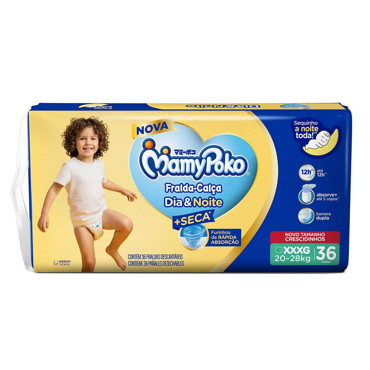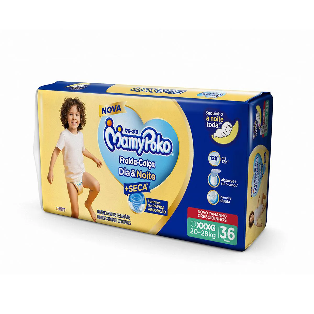 A MamyPoko Dia&Noite é uma fralda calça descartável ultra absorvente, desenvolvida tanto para uso diurno quanto noturno, capaz de absorver até 5 copos de líquido.