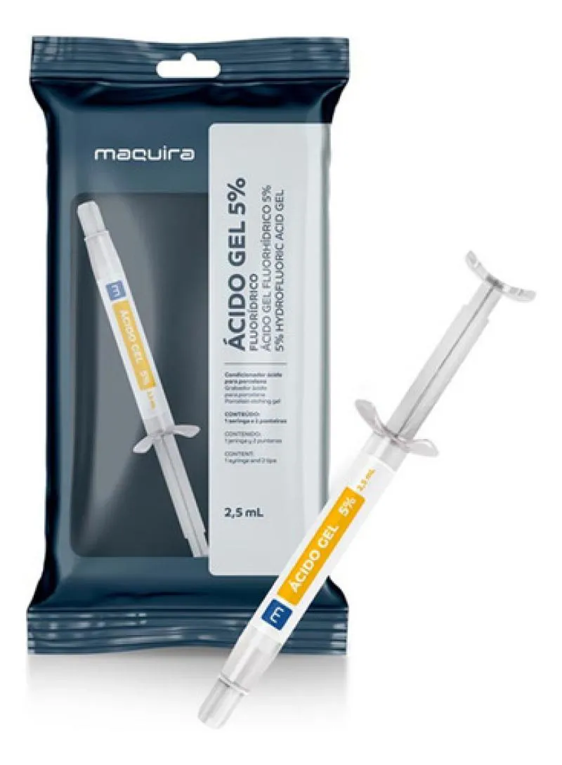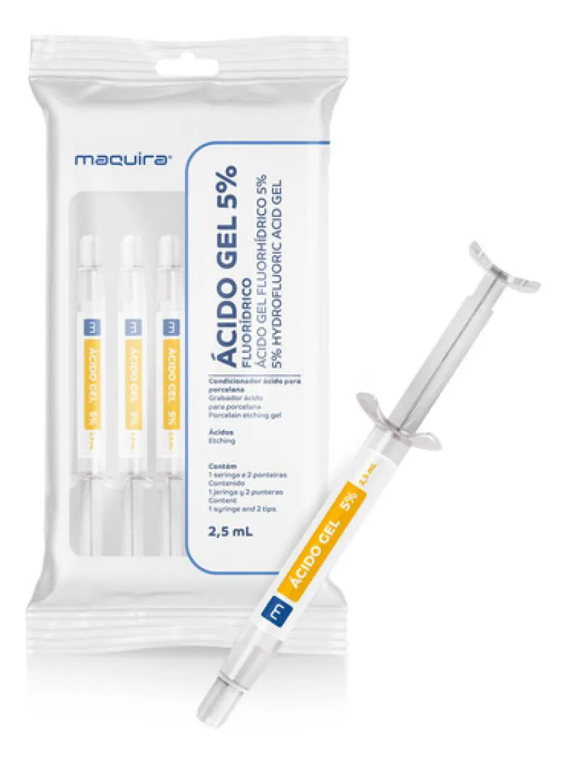 Ácido Gel 5% é um condicionador a base de ácido fluorídrico, na concentração de 5%, para condicionar superfícies de cerâmicas odontológicas e elevar a capacidade de retenção de materiais resinosos.