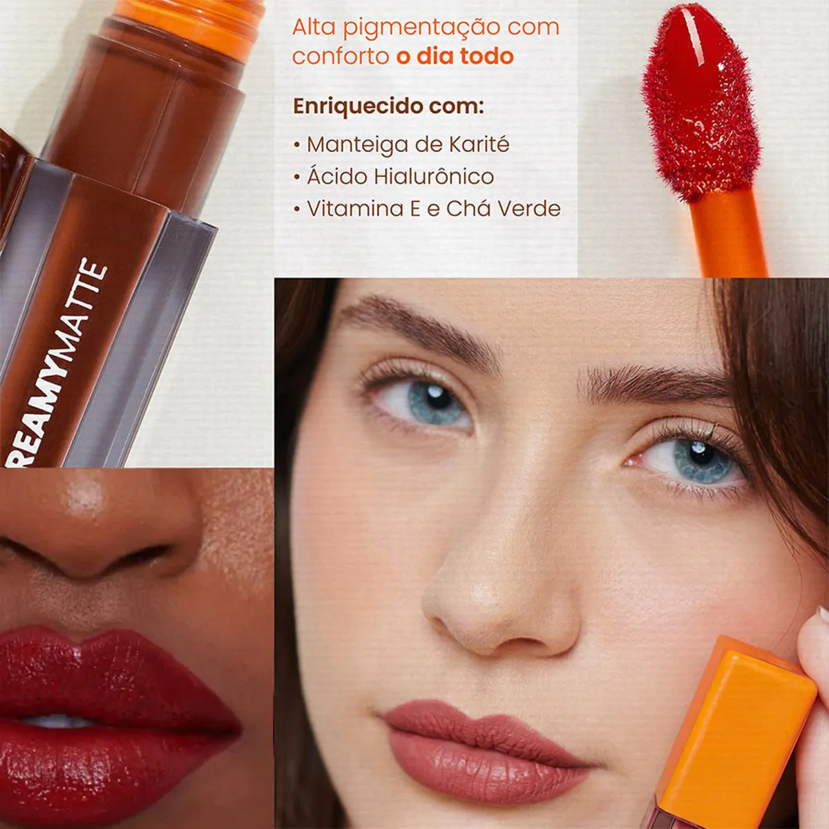 O Batom Creamy Matte combina alta pigmentação com acabamento aveludado e confortável, proporcionando lábios vibrantes, macios e sofisticados. Entrega cores intensas, textura aveludada, alta pigmentação, longa duração, confortável e com aplicador preciso.