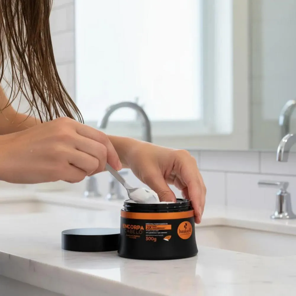 A máscara capilar Encorpa cabelo foi desenvolvida para tratar profundamente cabelos finos, ralos ou sem volume, promovendo mais densidade, força e encorpamento da fibra capilar sem comprometer o movimento natural dos fios. Sua ação intensiva atua desde a primeira aplicação, deixando o cabelo visivelmente mais cheio, resistente e saudável.A fórmula combina ácido hialurônico e colágeno vegetal, ativos que hidratam profundamente, reforçam a estrutura interna dos fios e auxiliam no espessamento progressivo da fibra capilar. Esse tratamento devolve corpo, melhora a textura e reduz o aspecto frágil e ralo, proporcionando maciez equilibrada e brilho natural.Com uso regular, os fios apresentam maior uniformidade, resistência à quebra e aparência mais densa, sendo uma excelente opção para quem busca volume real, hidratação eficaz e fortalecimento no cuidado semanal.