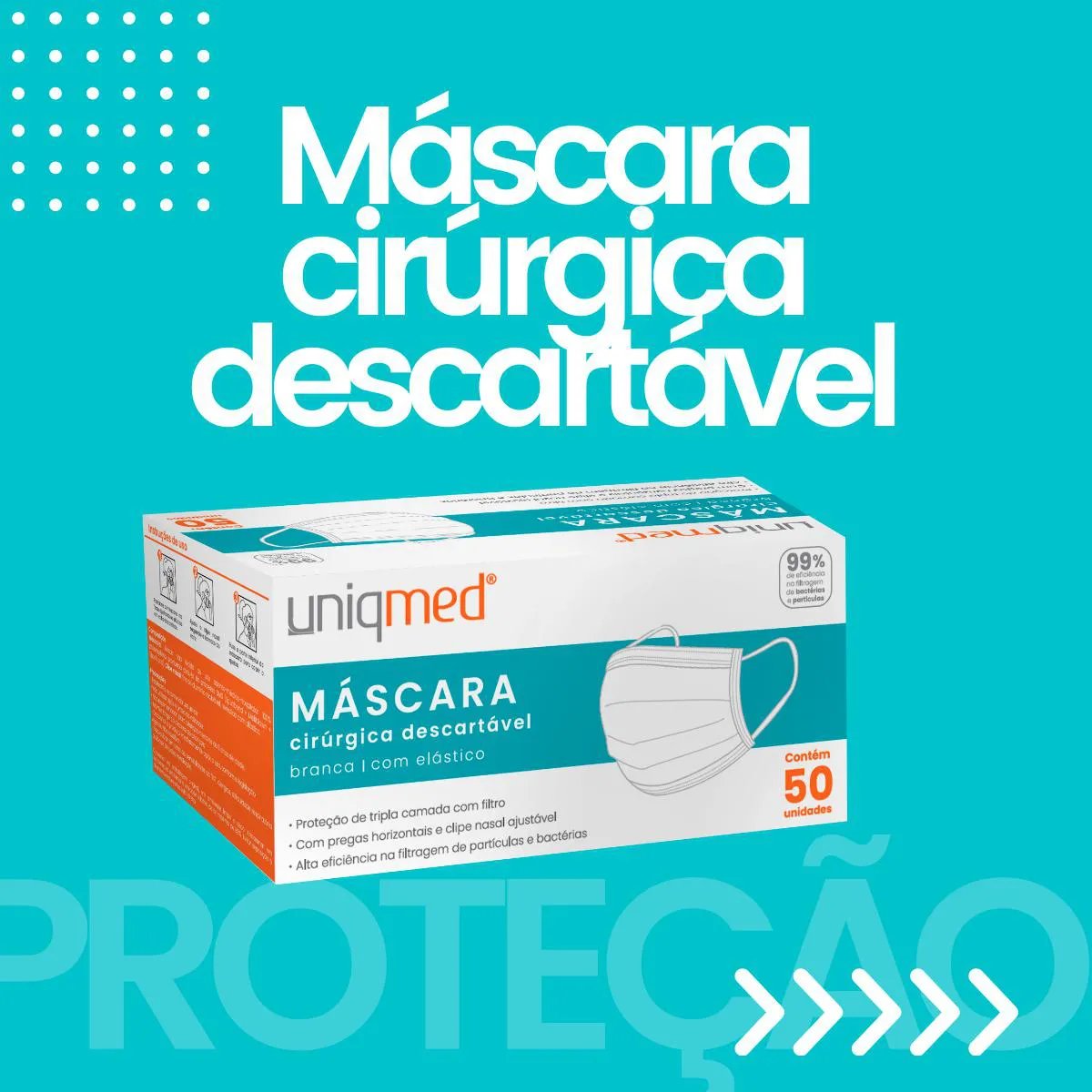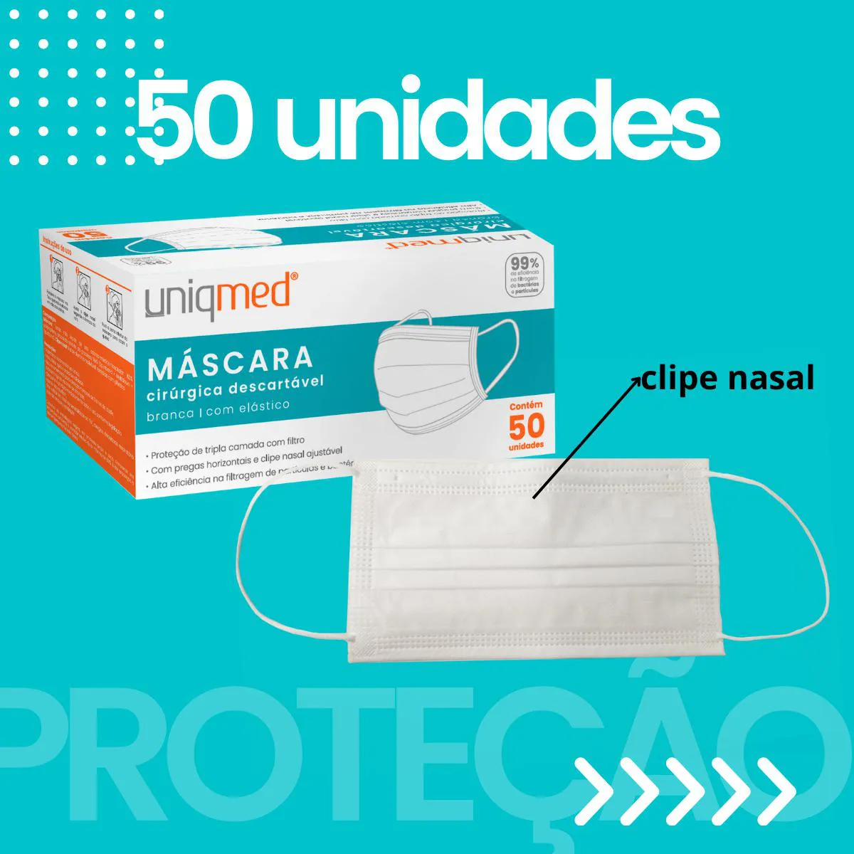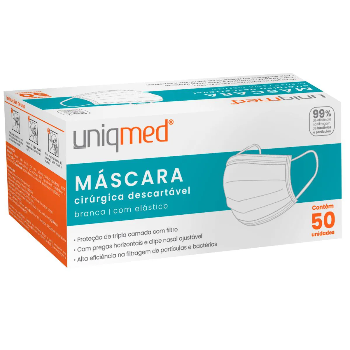 máscara CIRURGICA unissex- BRANCA 50 UNIDADES CAMADA TRIPLA DE PROTEÇÃO Definição Preocupado com a sua segurança contra doenças virais como gripes, resfriados, e a Covid? Não procure mais! Trazemos as Máscaras Cirúrgicas Uniqmed. Marca conhecida e reconhecida pelos profissionais de Saúde. Com um design cuidadosamente elaborado para o melhor conforto e eficácia na filtragem de partículas e bactérias. Características · Tripla Proteção: Nossas máscaras oferecem uma camada tripla de proteção com filtro; · Alta eficiência na filtragem de partículas e bactérias ; · 99% de eficiência na filtragem de bactérias; · 99% de eficiência na filtragem de partículas; · Com pregas horizontais e clipe nasal ajustável · TNT de qualidade Premium; · Elástico confortável e macio Outros diferenciais *Embalagem Econômica; *Design moderno; *Utilizada pelos profissionais de saúde presentes em hospitais, clinicas e laboratórios; Composição Tecido Não Tecido de uso odonto-médico-hospitalar 100% Propileno Clipe nasal: tira de alumínio maleável Indicações: *Clinicas de saúde; *Hospitais; *Unidades Básicas de Saúde; *Clinicas Odontológicas; *Atendimento Home Care; Entre outros Precauções: 1)Uso único; 2)Não utilizar o produto vencido; 3)Não recomendado para crianças menores de 3 anos; 4)Realizar o descarte adequado após o uso; 5)Contra indicado aos alérgicos de TNT; Compre agora e transforme sua vida! Postamos em até 24 horas após a confirmação do seu pedido.
