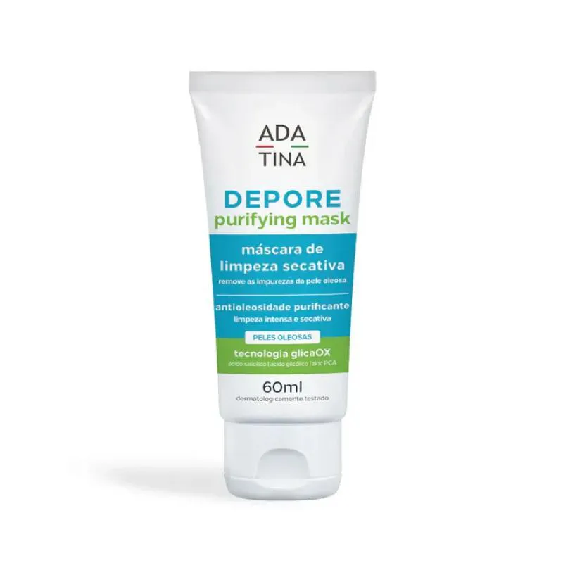 Depore Purifying Mask da ADA TINA é uma máscara de limpeza facial Anti-Oleosidade, especialmente desenvolvida para pele oleosa, acneica e com poros dilatados. Com a exclusiva tecnologia dermatológica GlicOX, combinação de Ácido Glicólico e Zinco PCA, associada ao Ácido Salicílico e Sílicas Secativas, oferece ação 3 em 1: combate à acne, clareia marcas e controla a oleosidade de forma eficaz e prolongada.Mais do que uma máscara, Depore Purifying Mask é um tratamento intensivo que atua na causa e nas consequências da oleosidade excessiva. Sua fórmula de alta performance remove profundamente as impurezas, resíduos de poluição e células mortas, deixando a pele mais limpa, purificada e saudável.