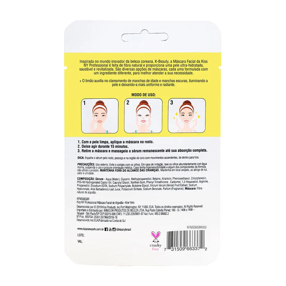 Inspirada no mundo inovador da beleza Coreana, K-Beauty, a máscara facial de tecido de Bambu da Kiss NY Professional é feita de fibra natural o que permite a penetração dos ativos de maneira mais eficaz e proporciona uma pele ultra-hidratada, saudável e revitalizada. Feita com limão, é ideal para iluminar o rosto quando a pele estiver opaca! Dermatologicamente testada, livre de parabenos e corantes artificias.