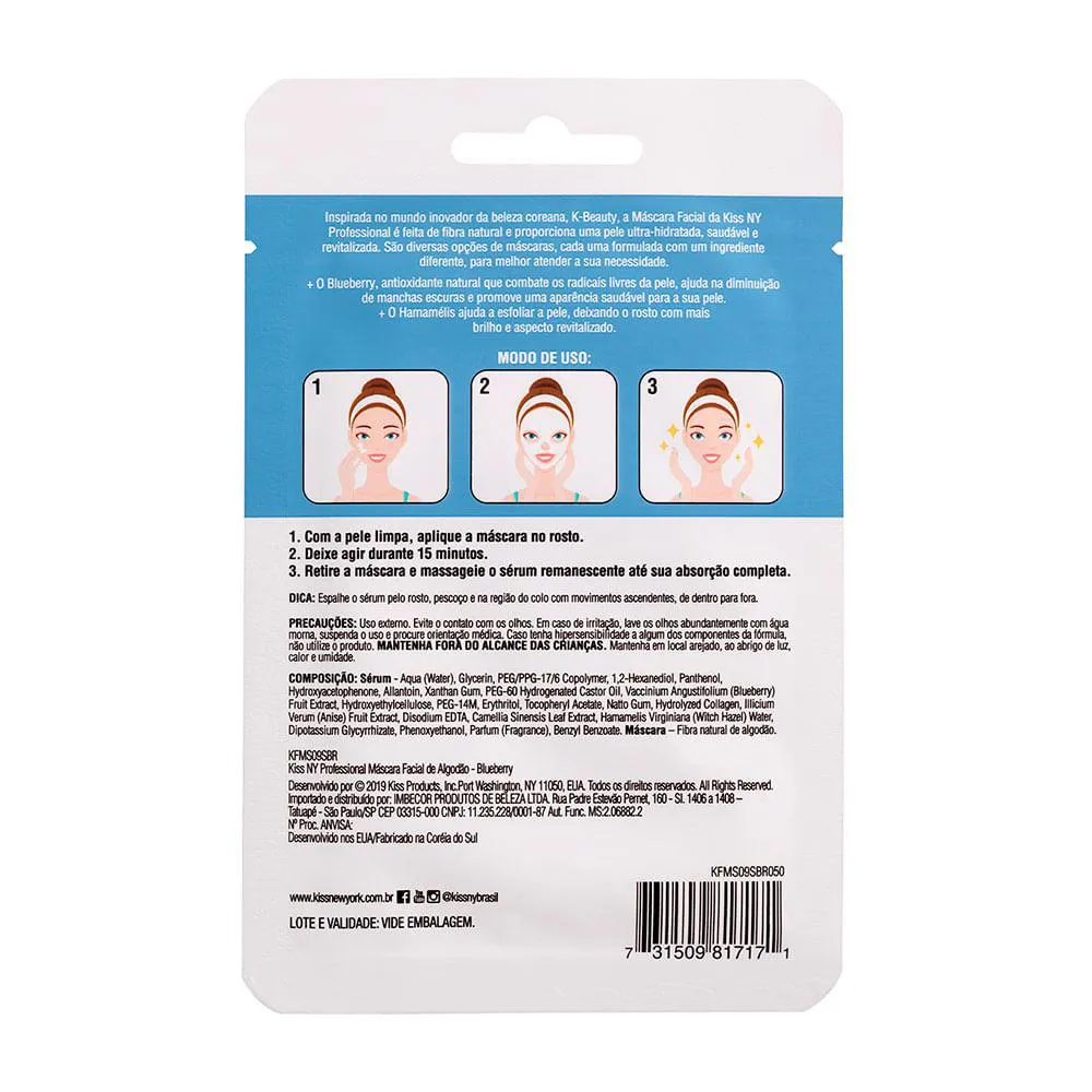 A Máscara Facial Kiss NY Professional é um produto de skincare inspirado na K-Beauty, fabricado em fibra natural de algodão e infundido com sérum, que contém ingredientes como Blueberry e Hamamélis. É uma máscara facial desenvolvida para hidratação e cuidados com a pele.
