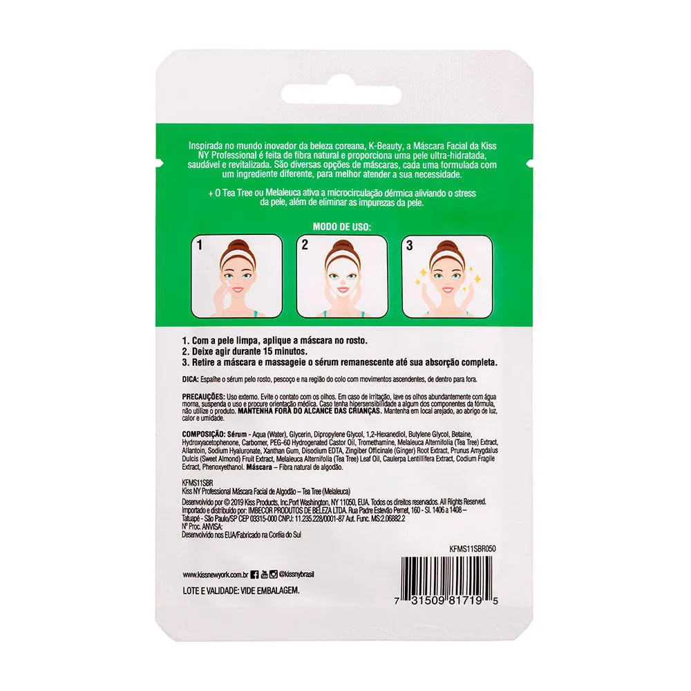 A Máscara Facial Kiss NY Professional é um produto de skincare inspirado na K-Beauty, fabricado com fibra natural de algodão e infundido com sérum de Tea Tree (Melaleuca). Desenvolvida com tecnologia sul-coreana, a máscara é projetada para tratamento facial que promove hidratação e revitalização da pele.