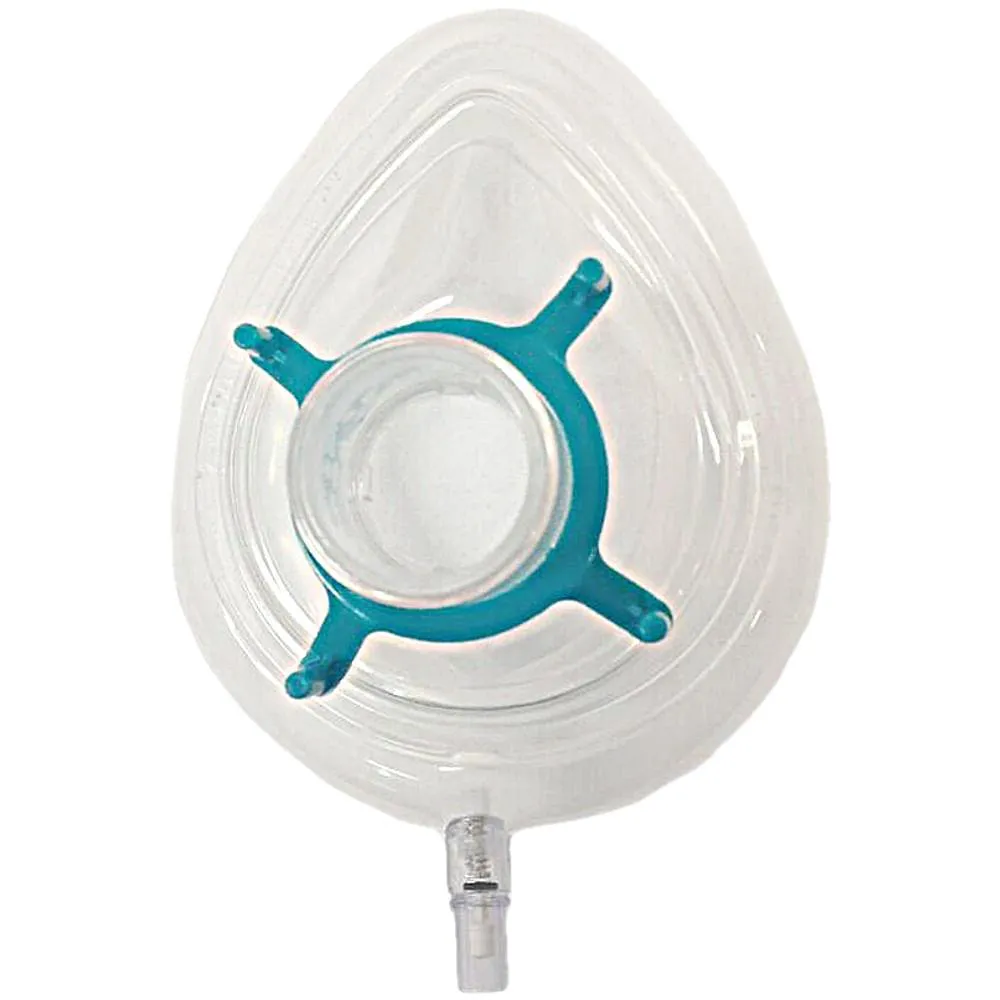 máscara facial com formato anatômico, constituída de cúpula em acrílico transparente para visualização segura da face do paciente e coxim inflável que permite selagem hermética por baixa pressão.