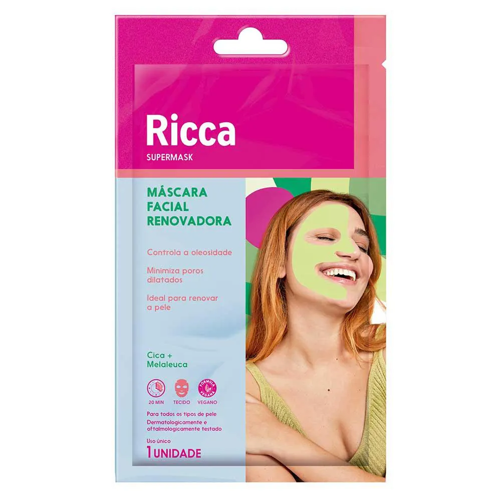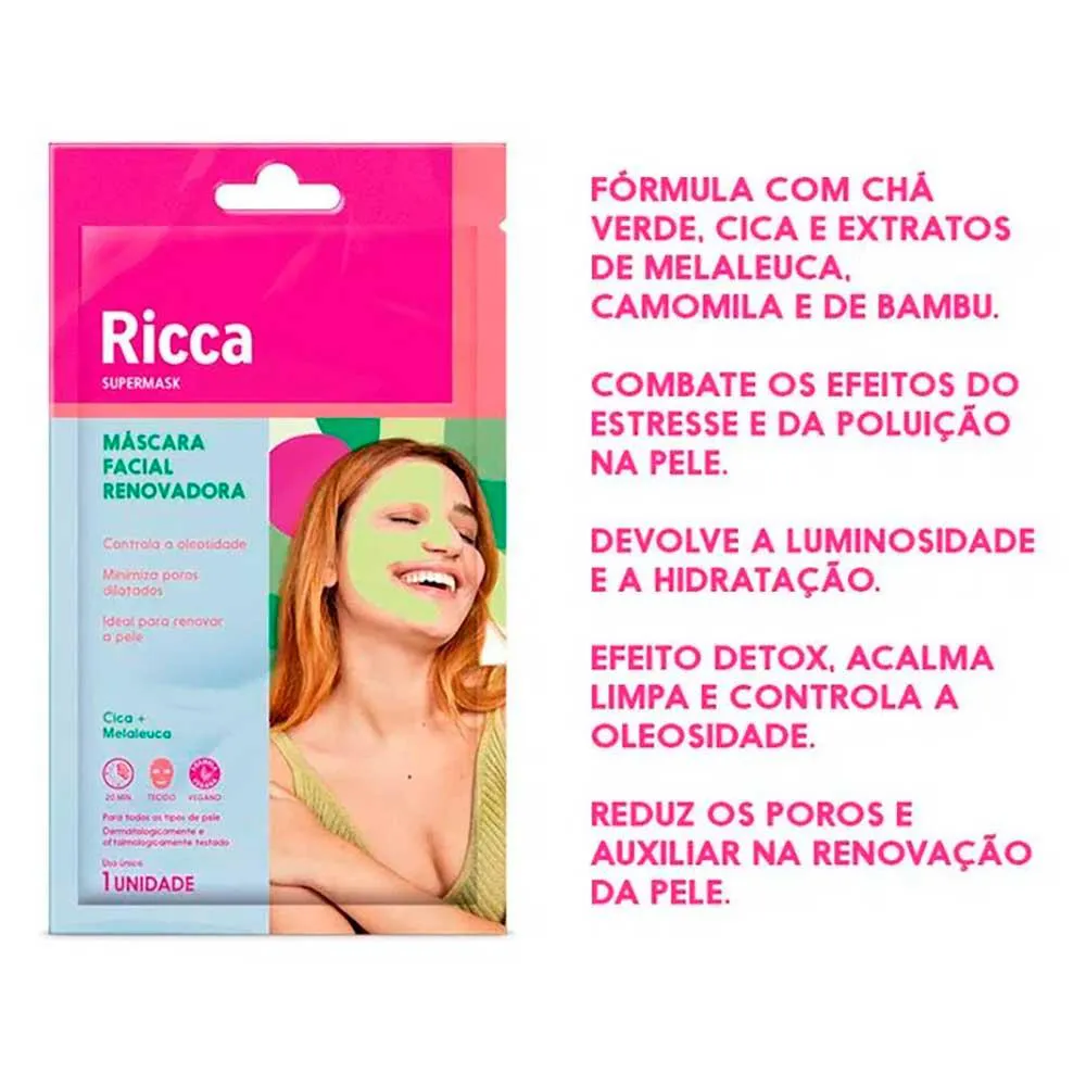 A máscara Renovadora de Ricca é o que você precisa para combater os efeitos do estresse e poluição na sua pele, a máscara promove uma desintoxicação das células, devolvendo a luminosidade e hidratação. A fórmula contém extratos de Camomila e Malaleuca que acalmam, limpam e reduzem a oleosidade da pele. Além da junção de hialuranato de sódio e extrato de Centella que auxilia na hidratação e renovação da pele.