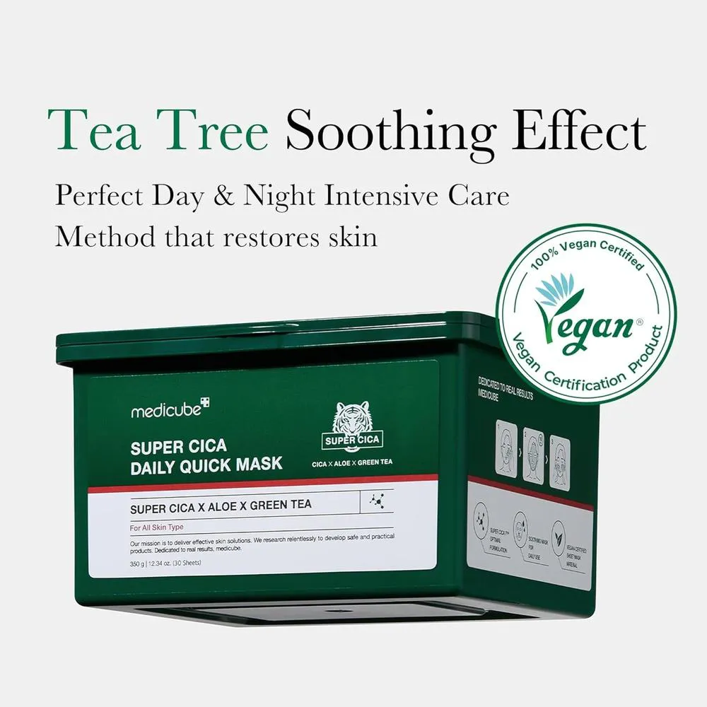 1. Medicube Super Cica Daily Quick Mask: Solução prática e vegana para acalmar a pele sensível e irritada em apenas 5 minutos. Esta máscara facial diária com 30 unidades atua na redução de vermelhidão e no alívio de peles reativas, ideal para um cuidado rápido e eficaz.