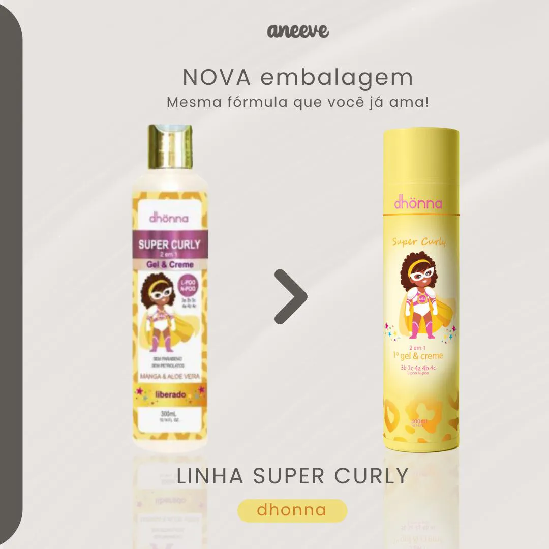 máscara infantil Dhonna Super Curly - 300g A linha Super Curly foi desenvolvida especialmente para cuidar dos cachos dos pequenos. Livre de sulfatos, petrolatos e parabenos, sua fórmula contém Manga e Aloe Vera, que promovem a reconstrução interna dos fios e mantêm o pH equilibrado.