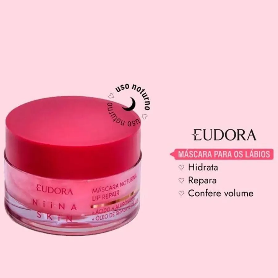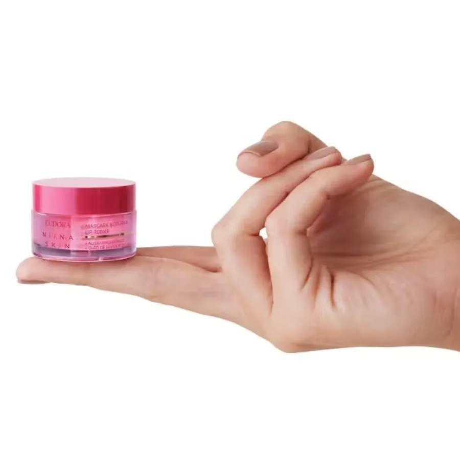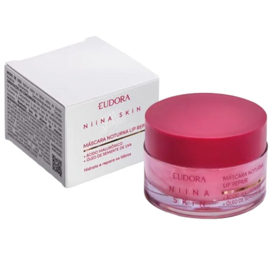 máscara Labial Noturna Lip Repair Niina Skin 9g A Máscara Labial Noturna Lip Repair Niina Skin entrega uma hidratação labial que repara os danos na 1ª noite de sono. Com ela, você acorda no dia seguinte com os lábios lindos e renovados em apenas 8 horas. Com Ácido Hialurônico, Óleo de Semente de Uva e colágeno Vegetal, esta máscara labial noturna proporciona até 24h de hidratação profunda, deixando os lábios macios e lisinhos. Além disso, protege contra o ressecamento ,formando uma película que repõe a hidratação dos lábios. Confira todos os benefícios que este hidratante labial entrega: Proporciona 24h de hidratação profunda; Com ácido Hialurônico, Óleo de Semente de Uva e Colágeno Vegetal; Deixa os lábios macios e lisinhos; Protege contra o ressecamento formando uma película que repõe a hidratação dos lábios; Textura amanteigada e não pegajosa. O segredo dos produtos de skincare Niina Skin foi revelado: sua tecnologia skin secrets traz um exclusivo blend de ativos dermatológicos que potencializam a hidratação e equilíbrio natural da barreira da pele: Niacinamida, a vitamina de Niina + Pentilenoglicol da Cana de Açúcar. Sua fórmula ultraconcentrada com rápida absorção fará você sentir a diferença na hidratação da pele rapidamente. Niina Skin, a especialista em cuidados com a pele co-criada entre Niina Secrets e Eudora, traz mais um produto revolucionário para a sua rotina de skincare! Nenhum produto Eudora é testado em animais, ou seja, este item possui selo Cruelty Free.