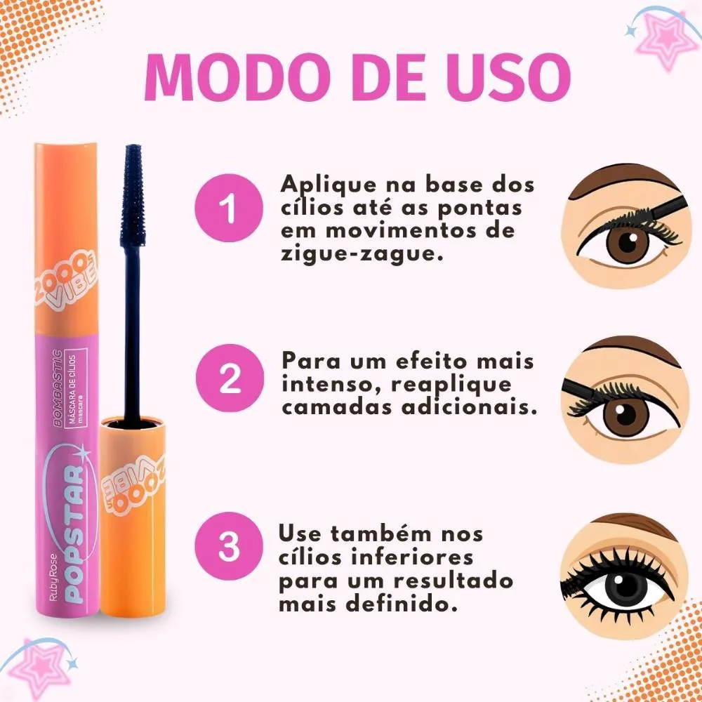 Para obter o melhor resultado, aplique a Máscara Para Cílios Ruby Rose Popstar Bombastic Black Eye Hb-e2004 rente aos cílios, da raiz às pontas dos fios. Para um efeito ainda mais intenso e volumoso, aplique várias camadas em movimentos de zigue-zague, garantindo que todos os cílios sejam cobertos. Espere alguns segundos entre as camadas para evitar grumos e garantir um acabamento perfeito.Anvisa: 25351.103133/2025-44