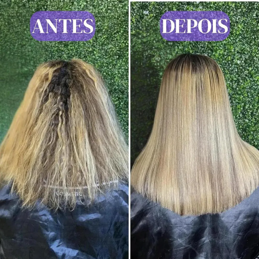 - Alinha fios e reduz frizz em cabelos loiros.