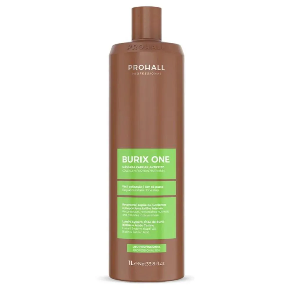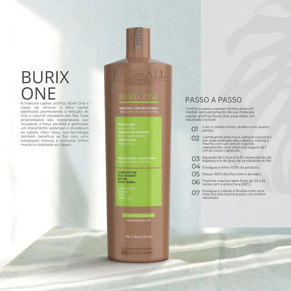 máscara de tratamento antifrizz térmico de alta performance, desenvolvido para realinhar, disciplinar e reestruturar profundamente a fibra capilar, promovendo fios mais alinhados, nutridos e com efeito liso prolongado, sem comprometer a saúde do cabelo.Sua fórmula avançada combina ativos naturais de origem amazônica e extração sustentável, que atuam diretamente na recuperação da força perdida, na selagem eficiente das cutículas e no equilíbrio da umidade natural dos fios. O resultado é um cabelo mais macio, brilhante, rejuvenescido e com frizz drasticamente reduzido, mesmo em fios sensibilizados.O Ácido Tanino promove alinhamento duradouro e ação antioxidante, protegendo contra o envelhecimento precoce da fibra. O Buriti, rico em vitamina A, garante hidratação profunda, redução do ressecamento e das pontas duplas. O Lumini System retexturiza a fibra capilar, potencializando a absorção de nutrientes e entregando brilho intenso. Já a Biotina fortalece a estrutura dos fios, aumentando a resistência e reduzindo quebra e queda.Indicado para todos os tipos de cabelo, inclusive quimicamente tratados ou em transição capilar, o Burix One é ideal para quem busca controle absoluto do frizz, alinhamento térmico, nutrição profunda e resultado profissional de longa duração, com fácil aplicação e alto rendimento.